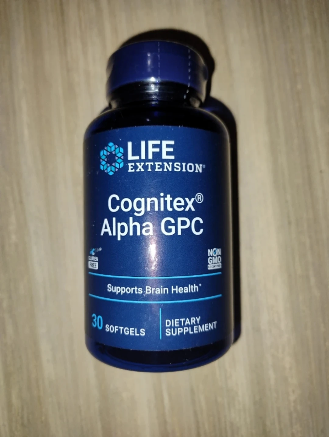 Unopened Life Extension Cognitex Alpha GPC, which supports brain health. It contains 30 softgels.