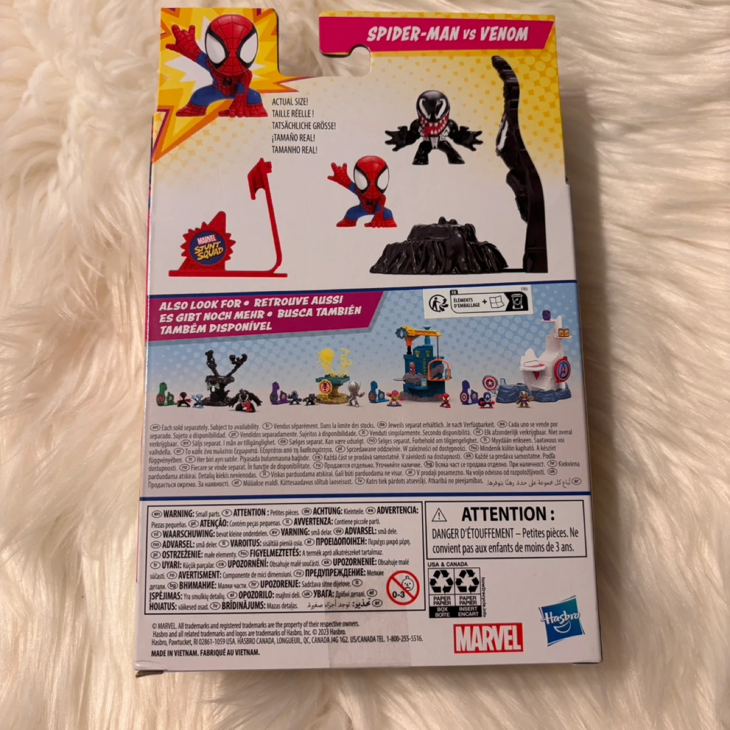 Selling a Marvel Stunt Squad set featuring Spider-Man versus Venom! The box includes the figures and accessories for some action-packed fun. It's suitable for ages 4 and up, and the packaging is plastic-free, except for tape and glue