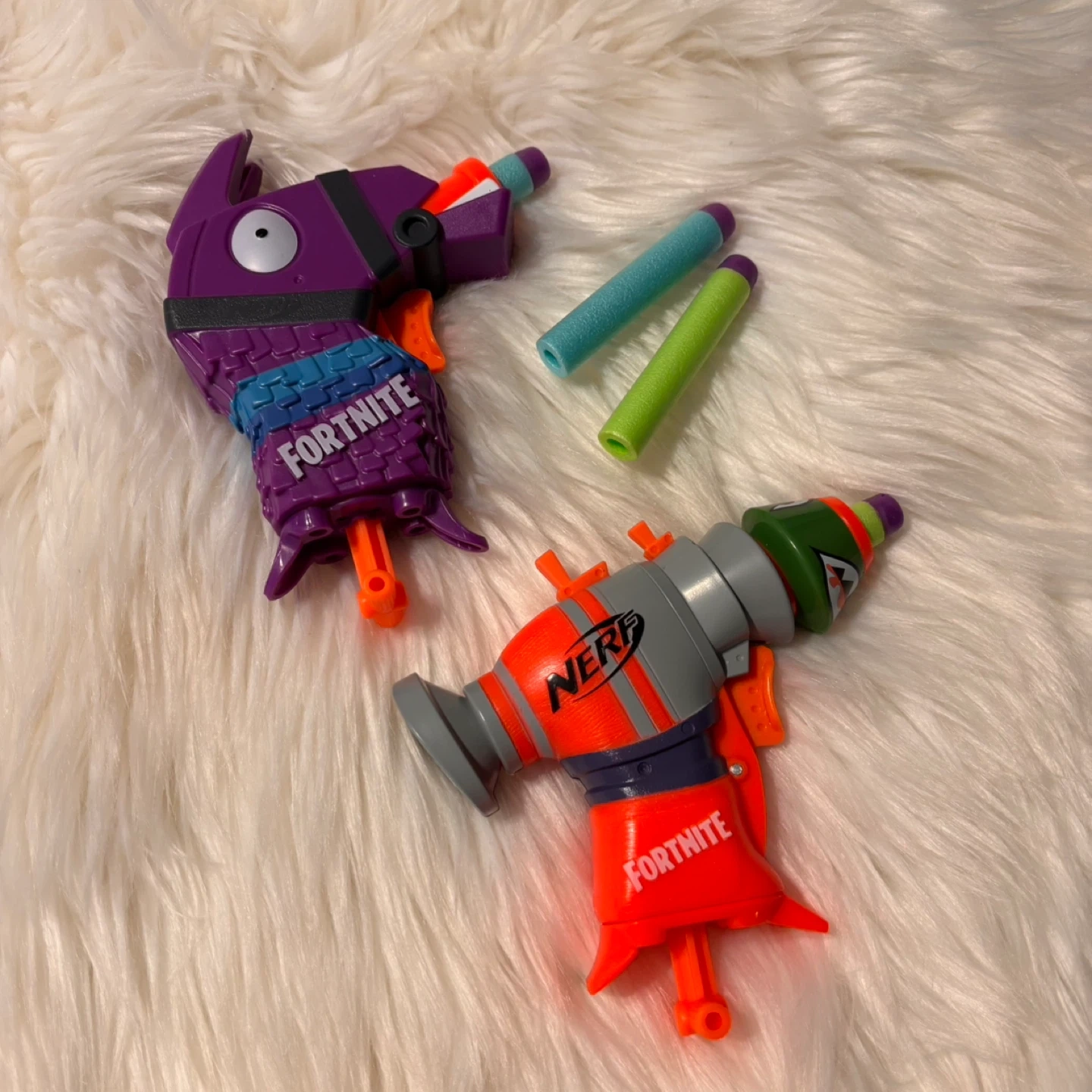 Selling a pair of Nerf Fortnite dart blasters! One is the Llama version and the other is the Micro TS. Comes with some darts to get you started. Great for some indoor fun!