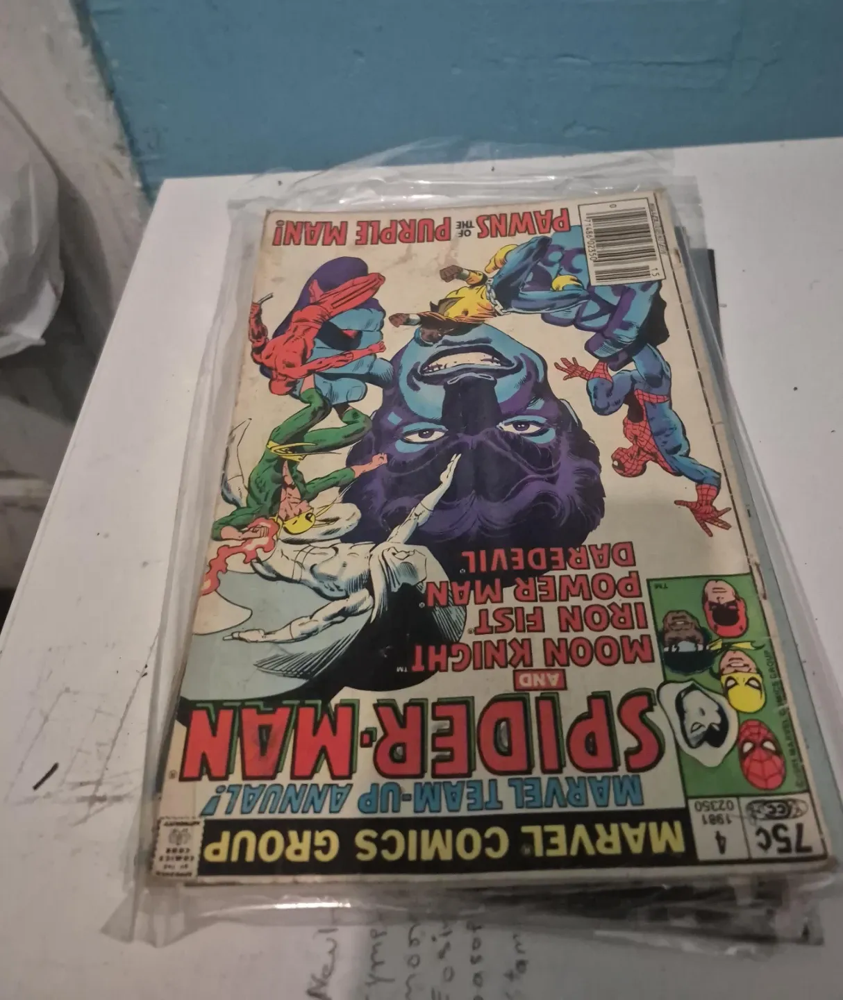 Selling a Marvel Team-Up Annual featuring Spider-Man, Moon Knight, Iron Fist, Power Man, and Daredevil! This comic book is from Marvel Comics Group. It includes Pawns of the Purple Man! It is from 1981.