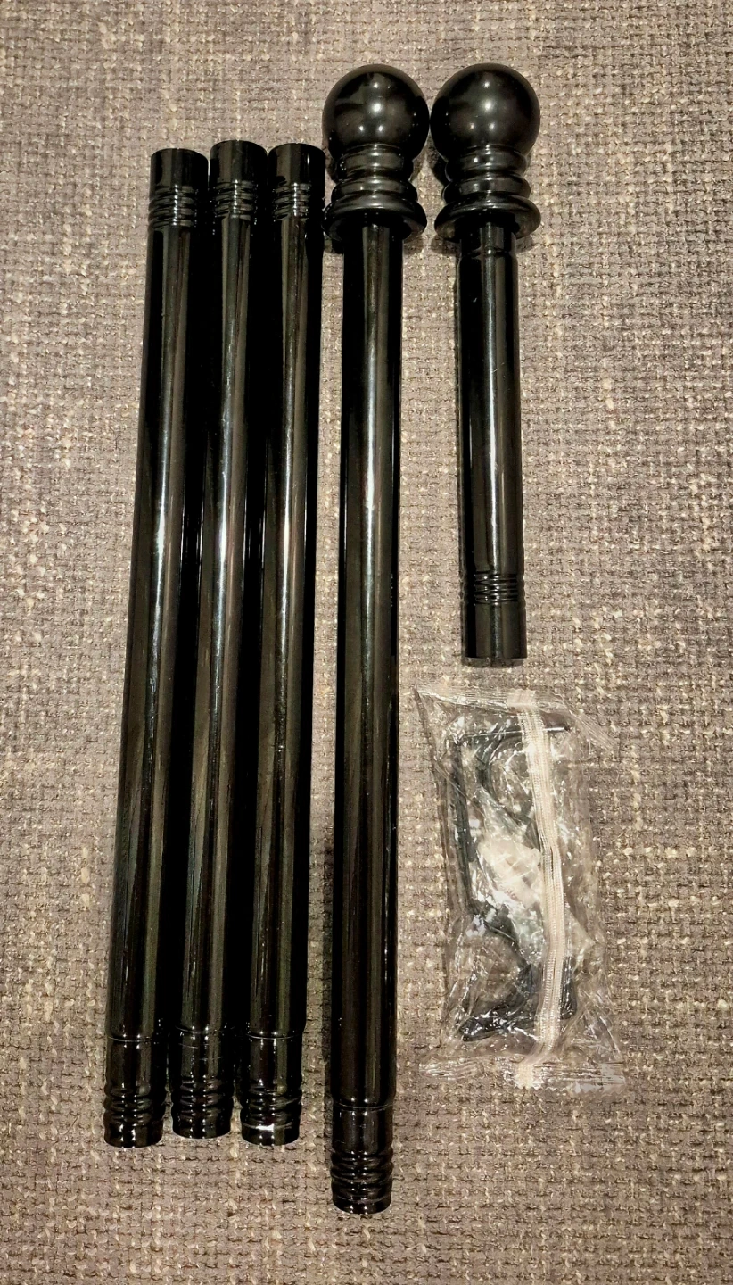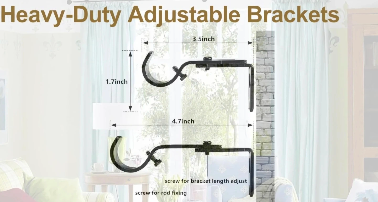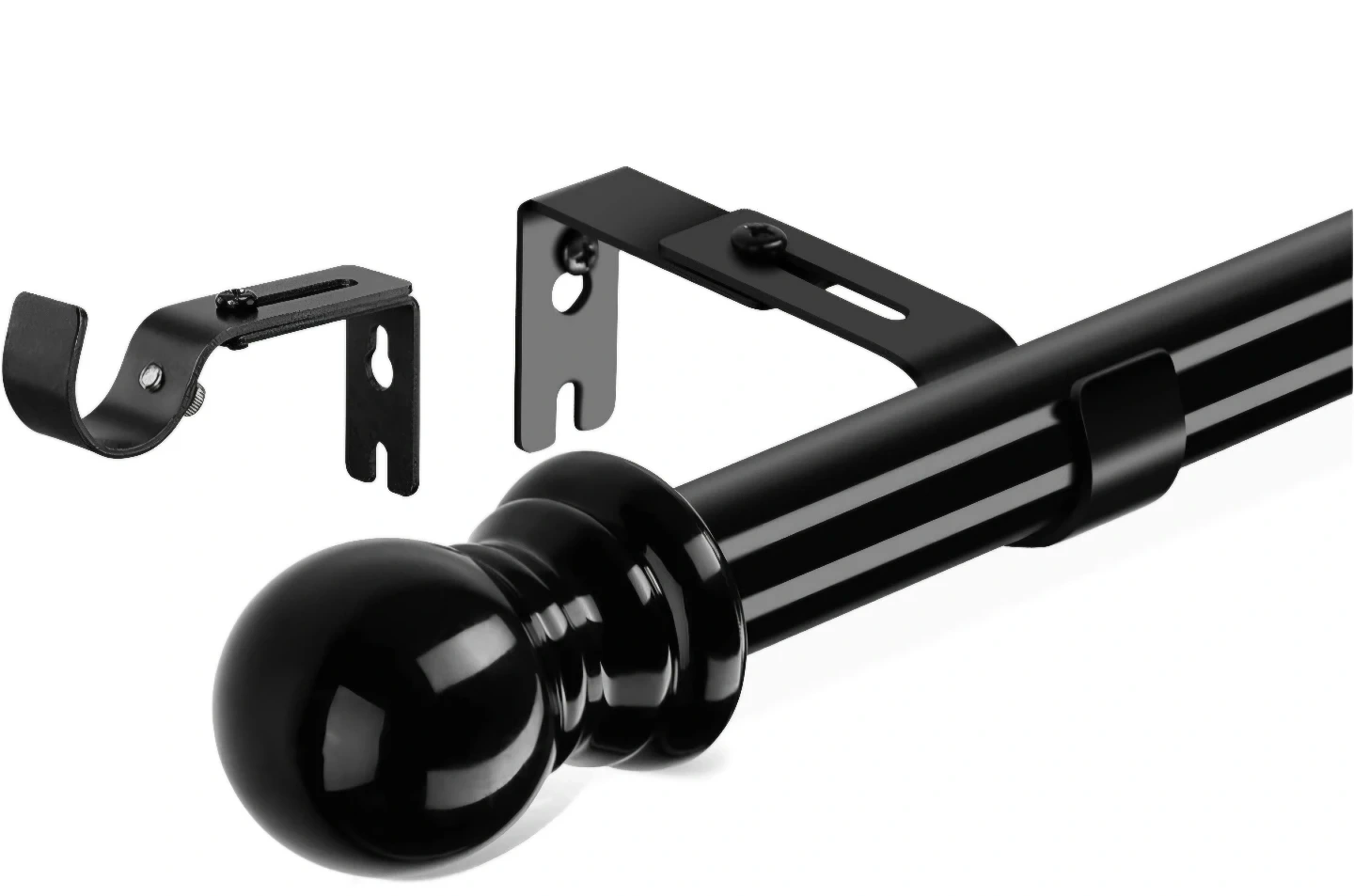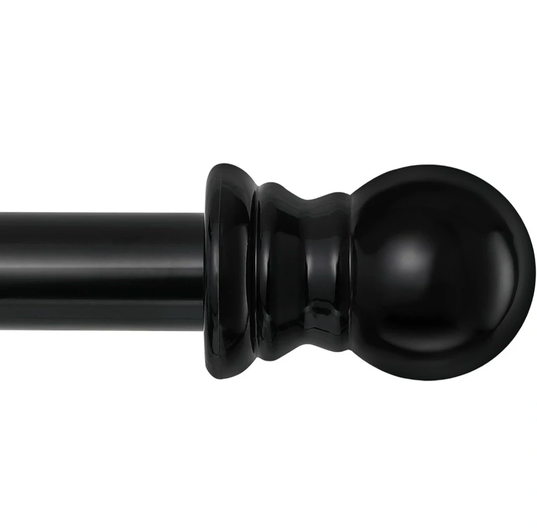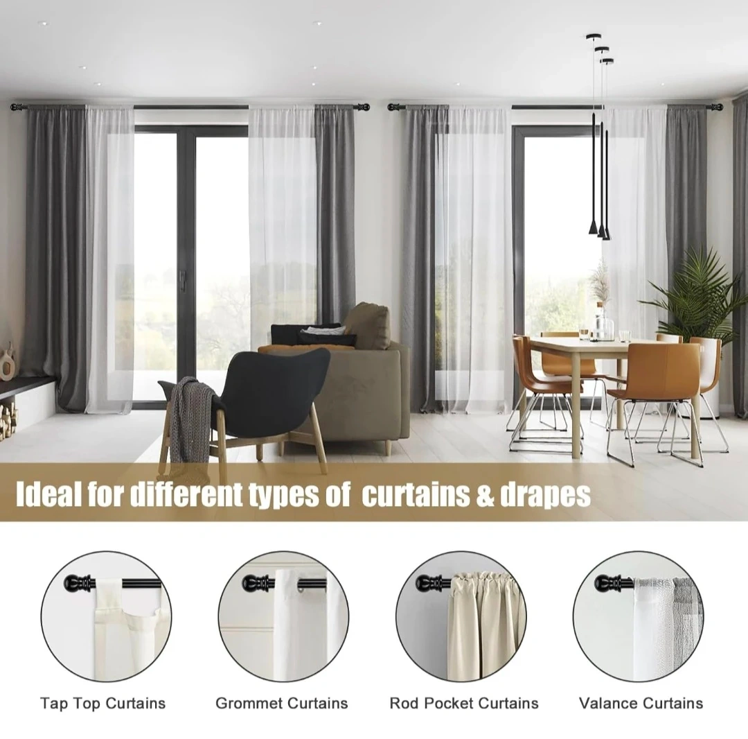 Black extendable curtain rod, hardware included. The rod is adjustable, Matte black telescoping curtain rod. Adjustable 28 to 65 inches. Heavy Duty. 1in diameter.