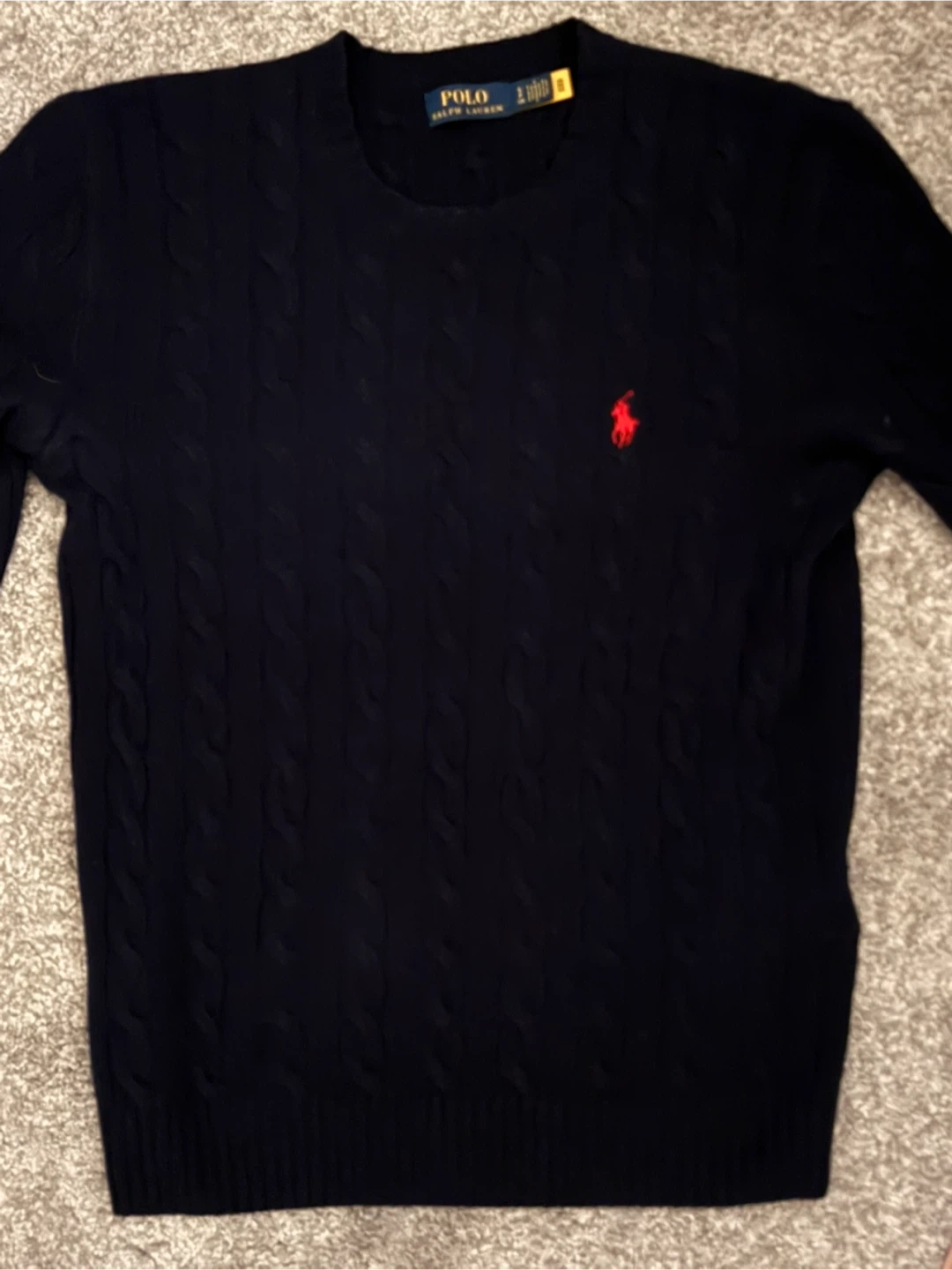 Classic Ralph Lauren Polo cable knit sweater in a navy colour.