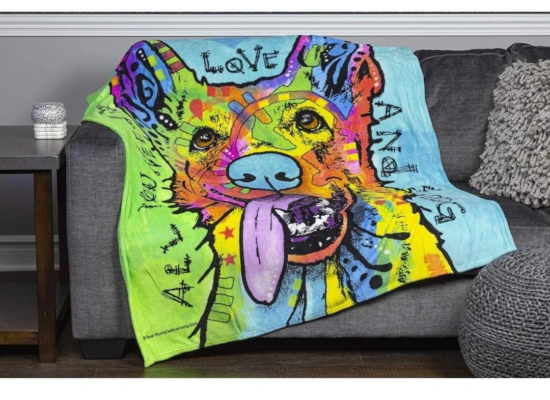 Designed for both comfort and style, this plush fleece throw features a vibrant German Shepherd design by renowned artist Dean Russo — perfect for cozy nights or adding character to your space.