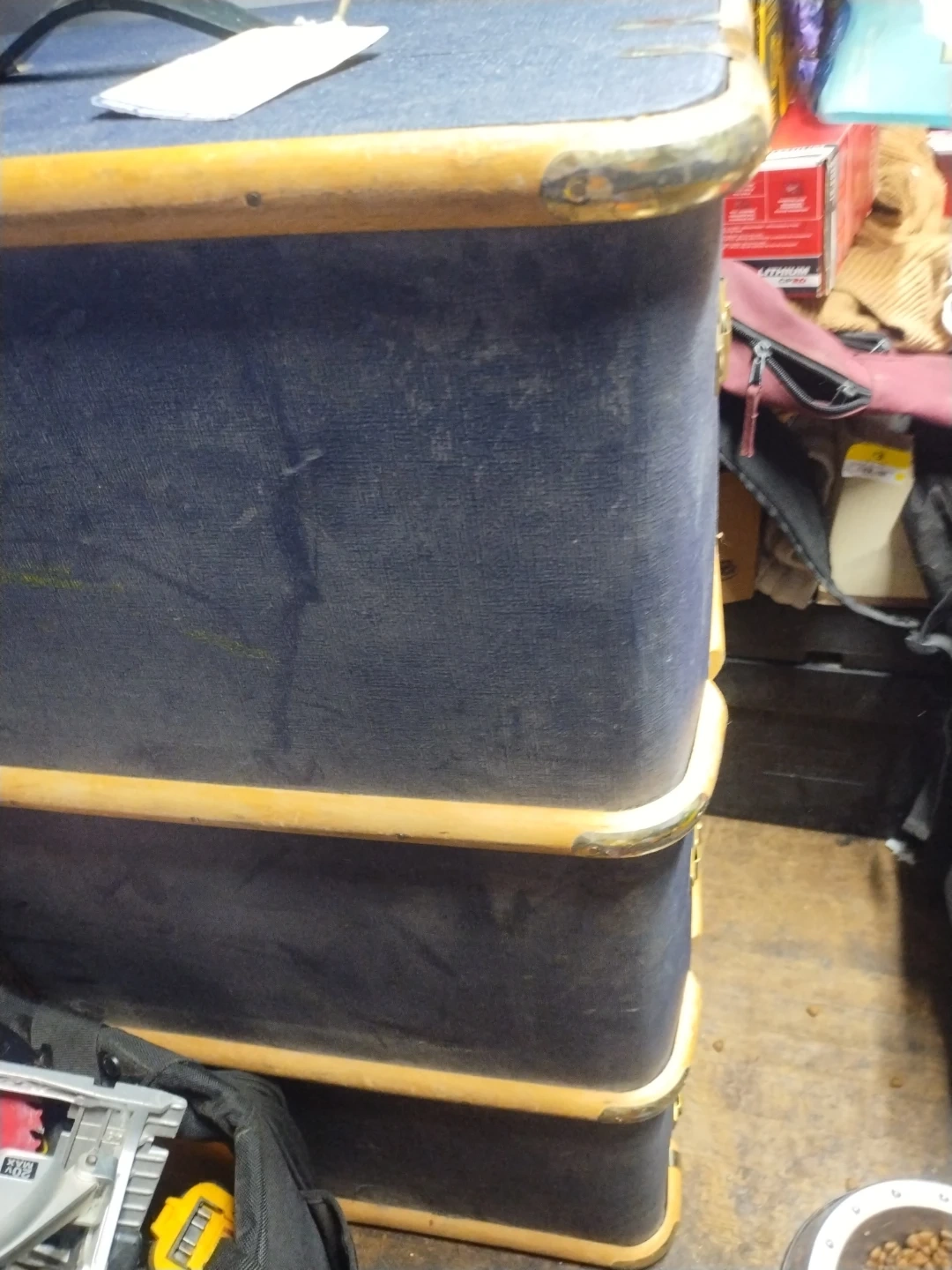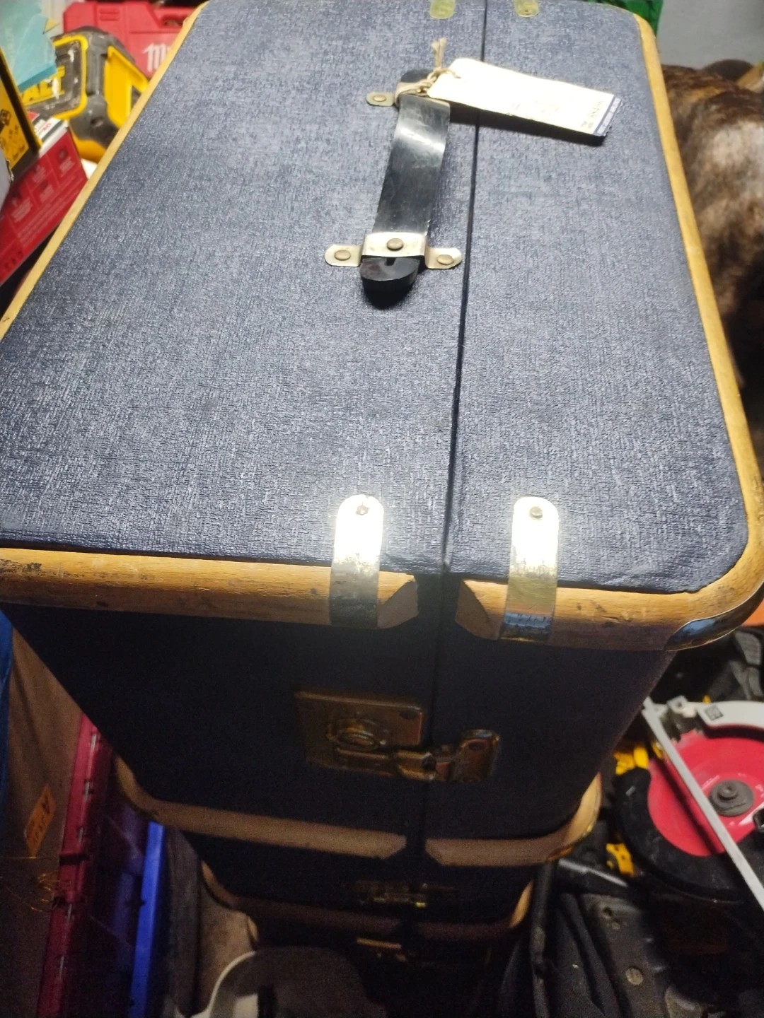 Selling a vintage blue trunk! It has a unique look with its wooden trim and brass hardware. Perfect for adding a touch of retro style to your home or for storage