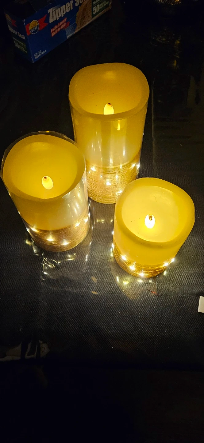 Selling a set of three LED candles, each wrapped with delicate string lights. They each require 3x AAA batteries to operate, which are easily replaceable (BATTERIES NOT INCLUDED). Sorry, one of the covers for the battery compartment is missing. PU Coppersmith/Ironwood Plaza.