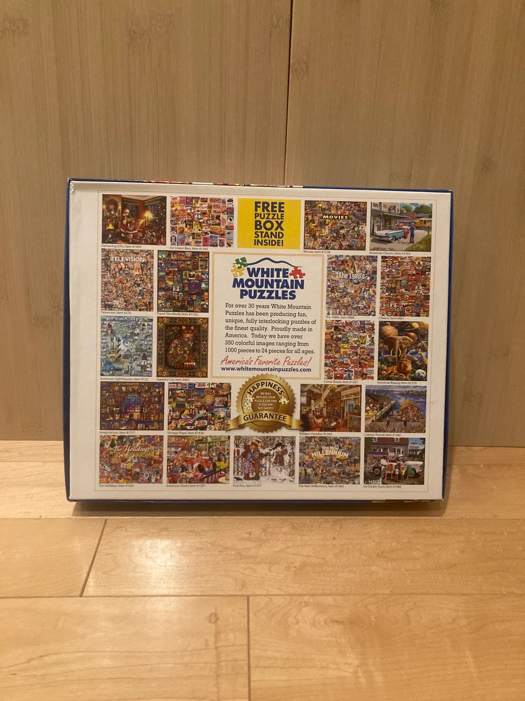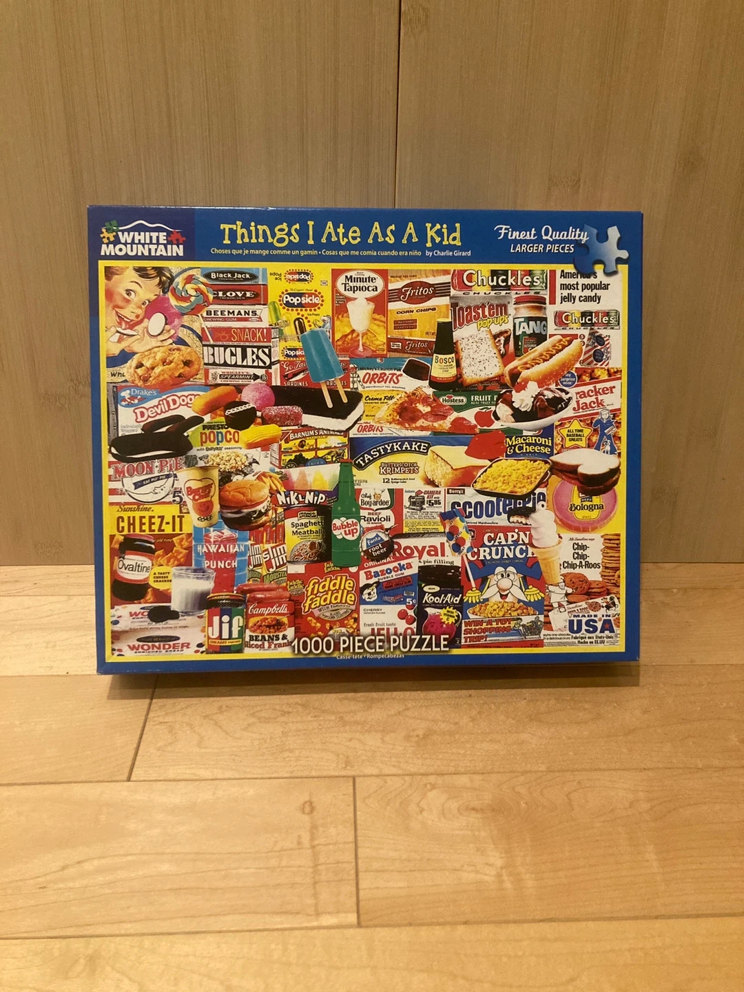 Looking to sell this White Mountain 1000-piece puzzle called 'Things I Ate As A Kid'! It features a collage of classic snacks and treats. The puzzle box is included and measures 24" x 30". It's a fun challenge for puzzle enthusiasts