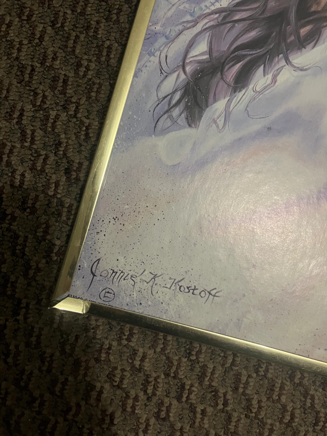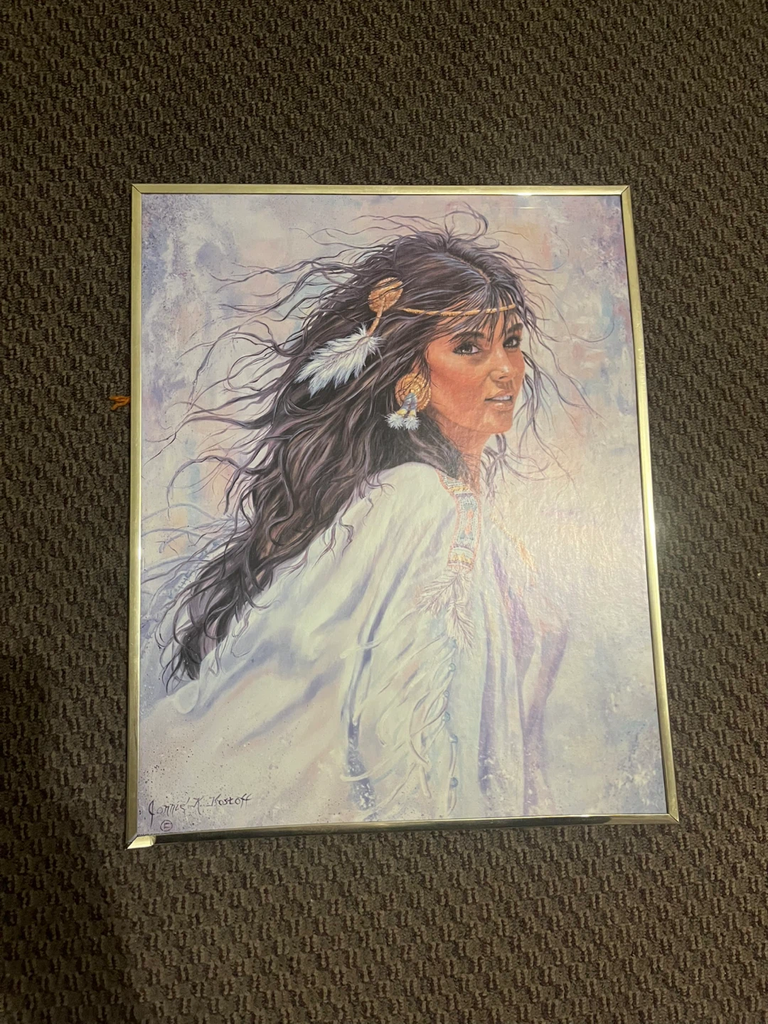 The Jonnie K. Kostoff framed art print features a portrait orientation of a Native American/Indigenous woman, signed by the artist. Measuring 20x24