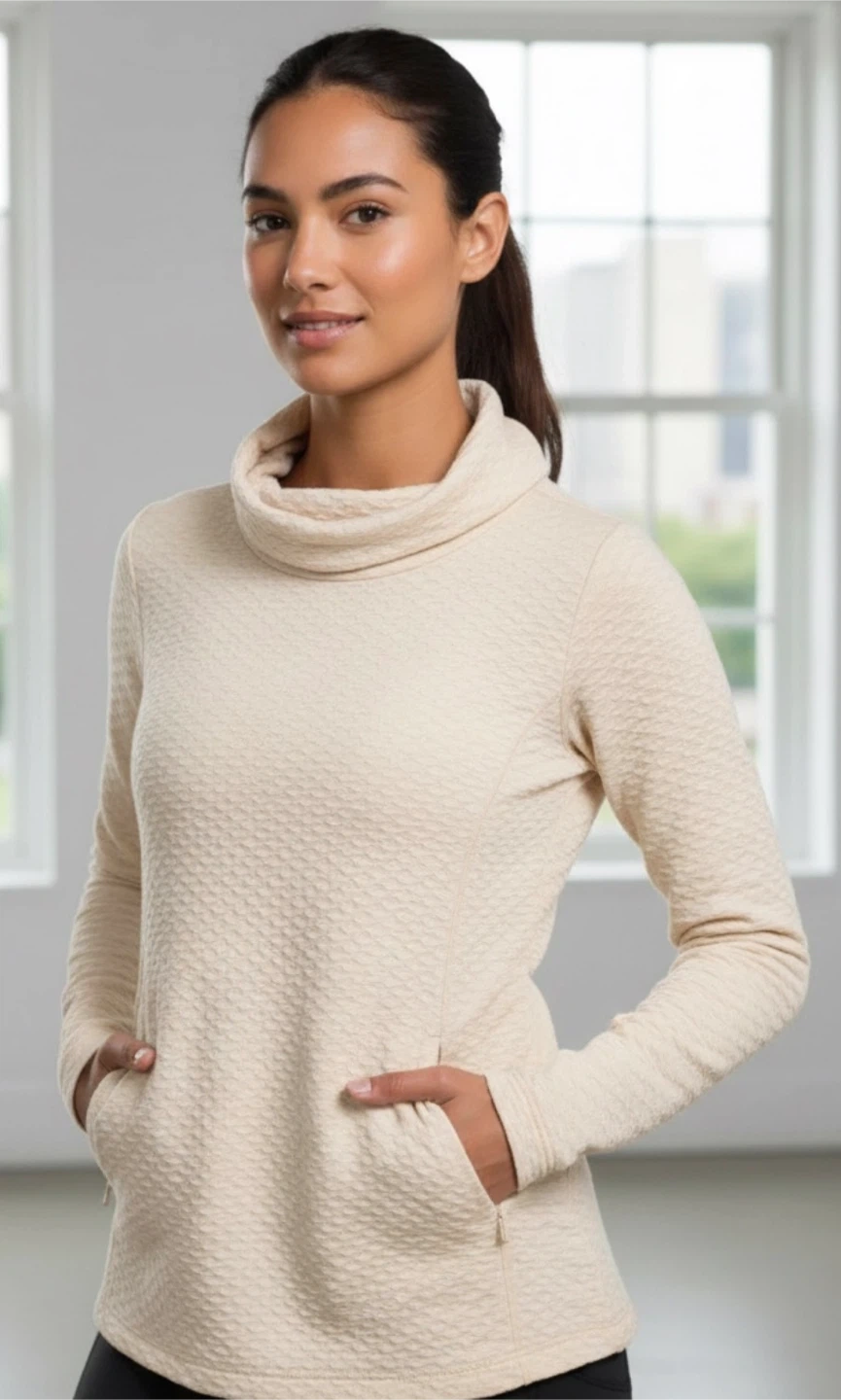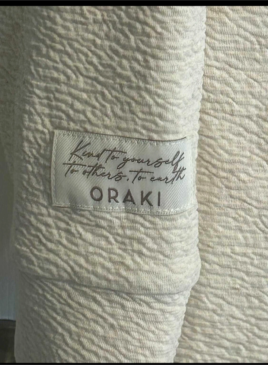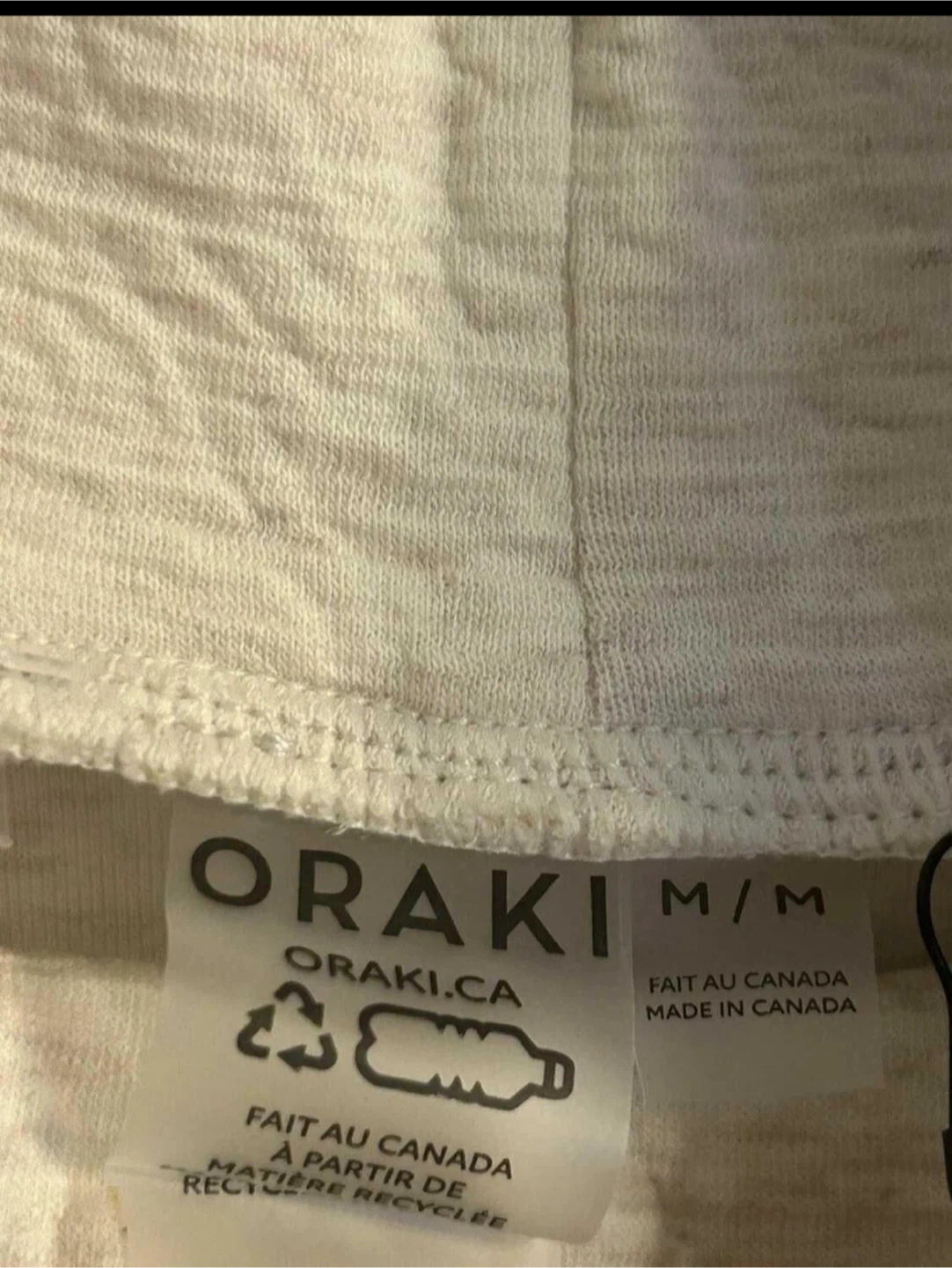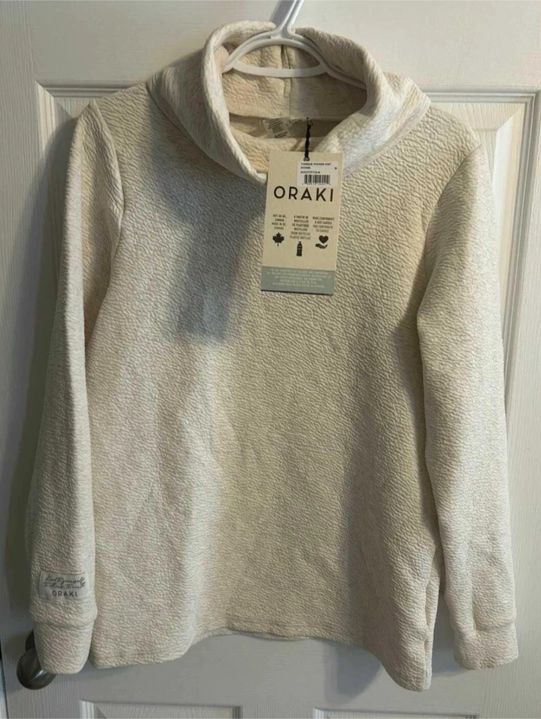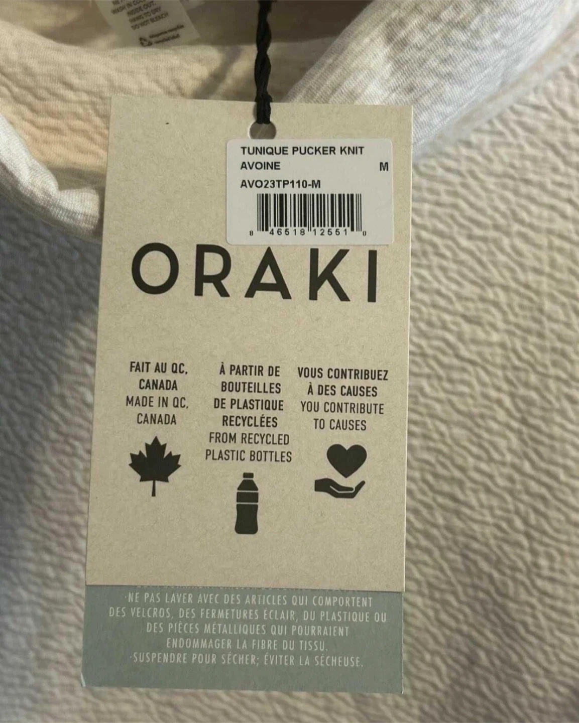 Selling a brand new ORAKI Tunique Pucker Knit in size M. This stylish tunic is made in QC, Canada, and crafted from recycled plastic bottles. It's a lovely avoine (oatmeal) colour and has a unique pucker knit texture. Perfect for adding a touch of Canadian-made comfort to your wardrobe!