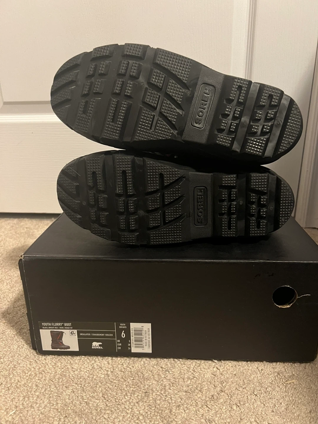 Sorel Youth Flurry Boots in black and bright red, SIZE 6. These boots are insulated and come with the original box and tag.