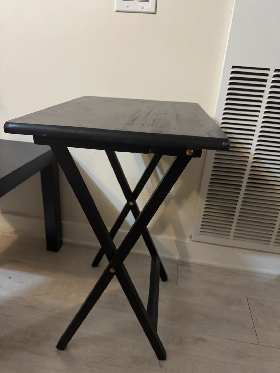 Selling a handy folding tray table in black. It's in good condition and perfect for snacks, meals, or working from the couch. Easy to fold up and store when not in use!