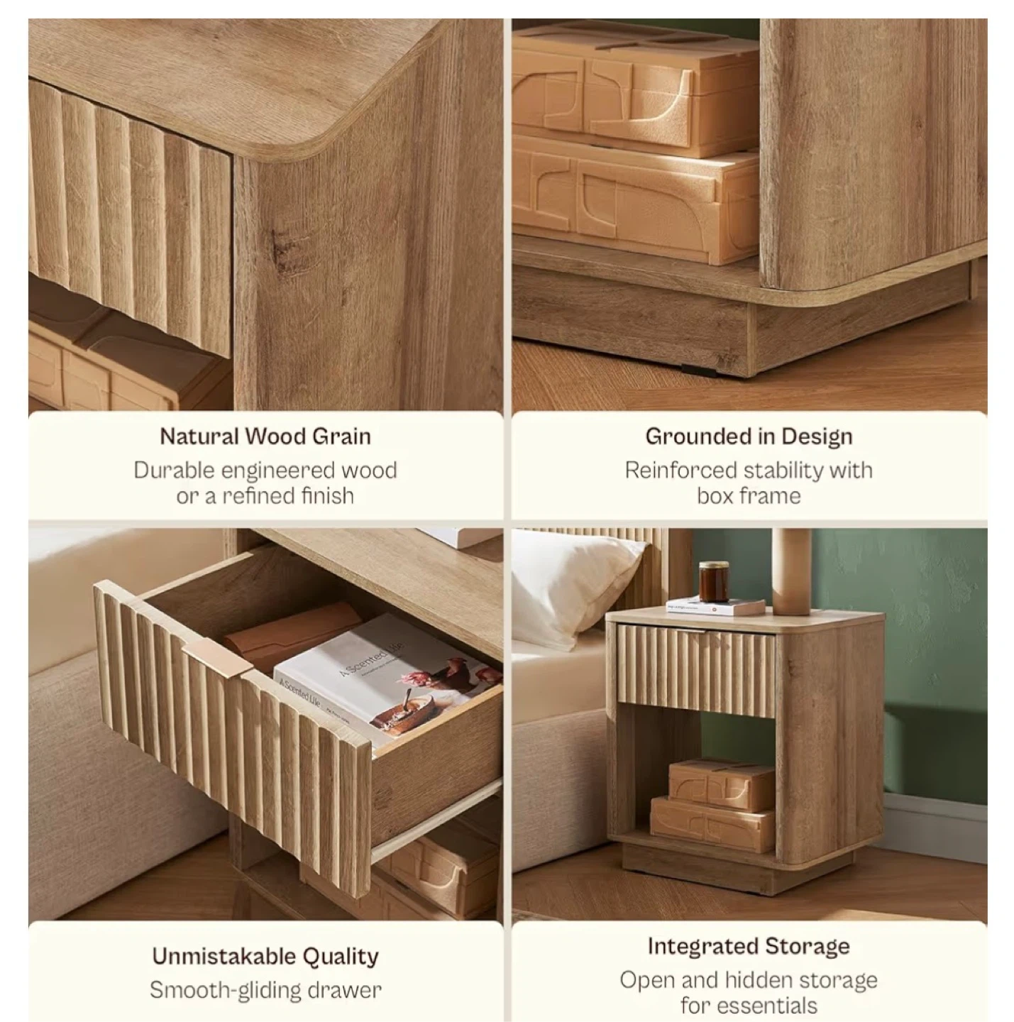 This wood nightstand features a natural wood grain finish and a smooth-gliding drawer. It has both open and hidden storage for essentials.