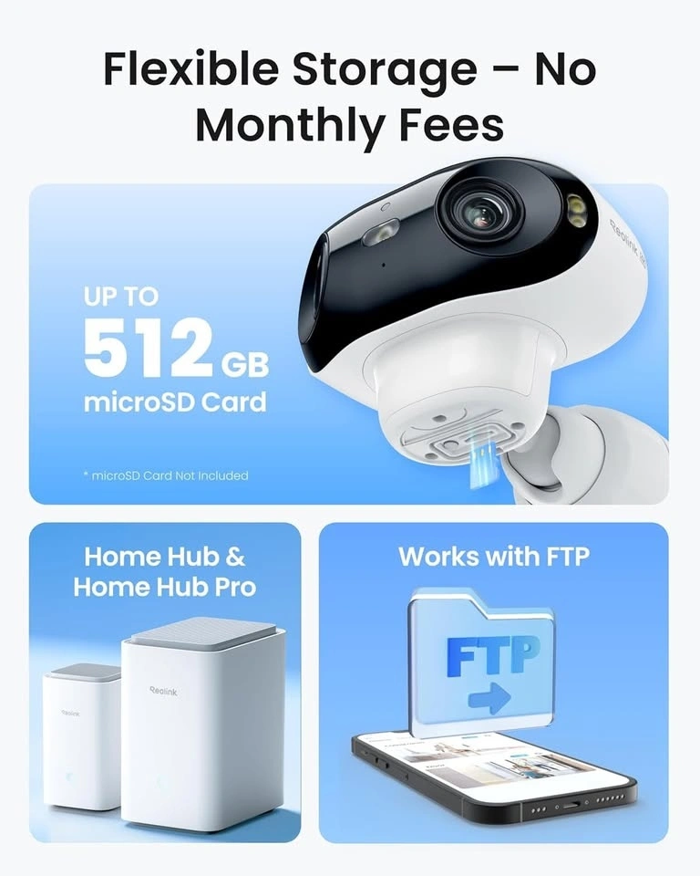 Store all your recordings locally on a microSD card (Up to 512GB, buy separately) or the Reolink Home Hub (supports up to 2x512GB microSD cards). Enjoy peace of mind with no worries about data leaks. Access all footage conveniently, even when the network is offline.