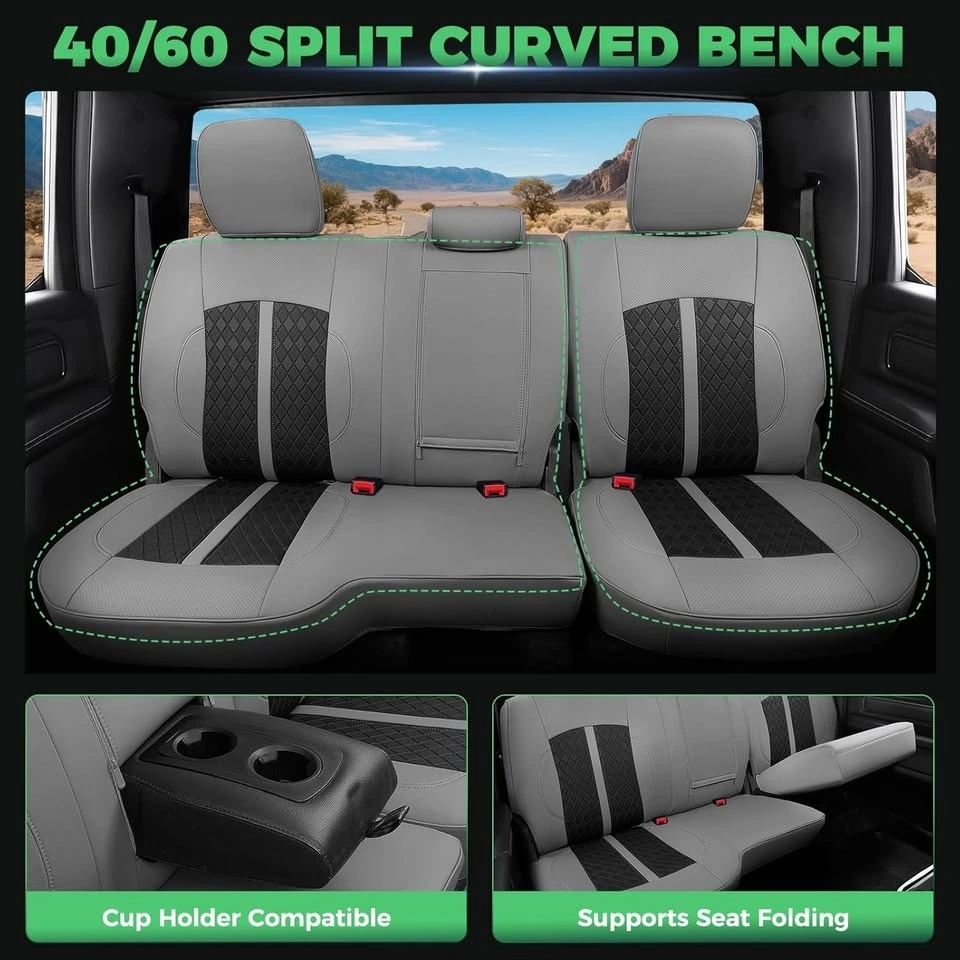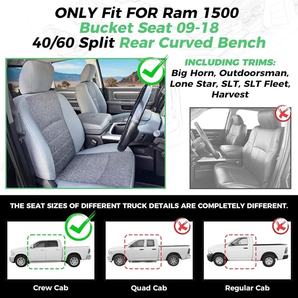 Exclusively designed for Dodge Ram, 4 Door Crew Cab - Big Horn, SLT, Outdoorsman, Lone Star, Harvest 2009 - 2018, since they have the same or similar seat size. (40/60 Split-Curved Bench, NOT fit for Bench Seat, Regular/Extended/Quad Cab)