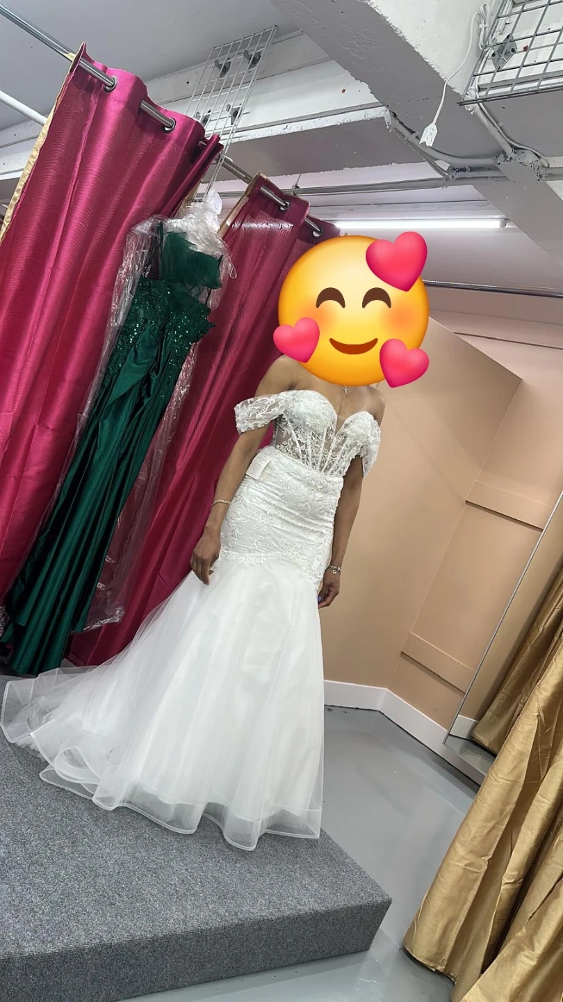 Selling a beautiful white wedding dress. It features a fitted bodice with lace detailing and a flowing skirt. It's in great condition and ready for your special day!