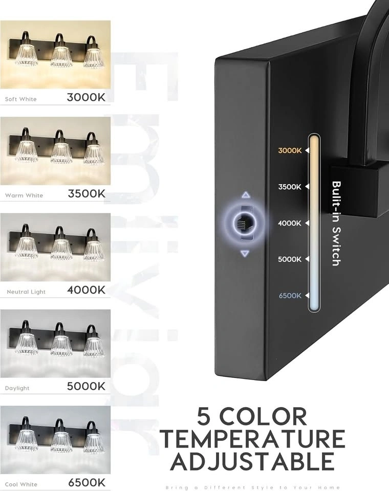 This black bathroom vanity offers 5CCT (3000K/3500K/4000K/5000K/6000K). Just slide the button on side of the back plate, and freely choose soft white/warm white/cool white/daylight color temperature to meet your needs. It's also dimmable from 10% to 100%, compatible with most dimmers on the market (dimmer switch NOT included).