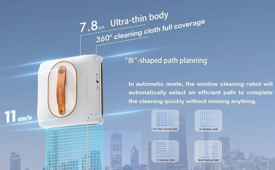 When the window cleaning robot is turned on, Z-shaped cleaning is started by default. The remote control can switch to N-shaped edge cleaning mode. If you encounter glass with relatively large stains you can use N+Z cleaning mode. It is also equipped with left and right area cleaning to help you better clean the stubborn stains areas of the glass.