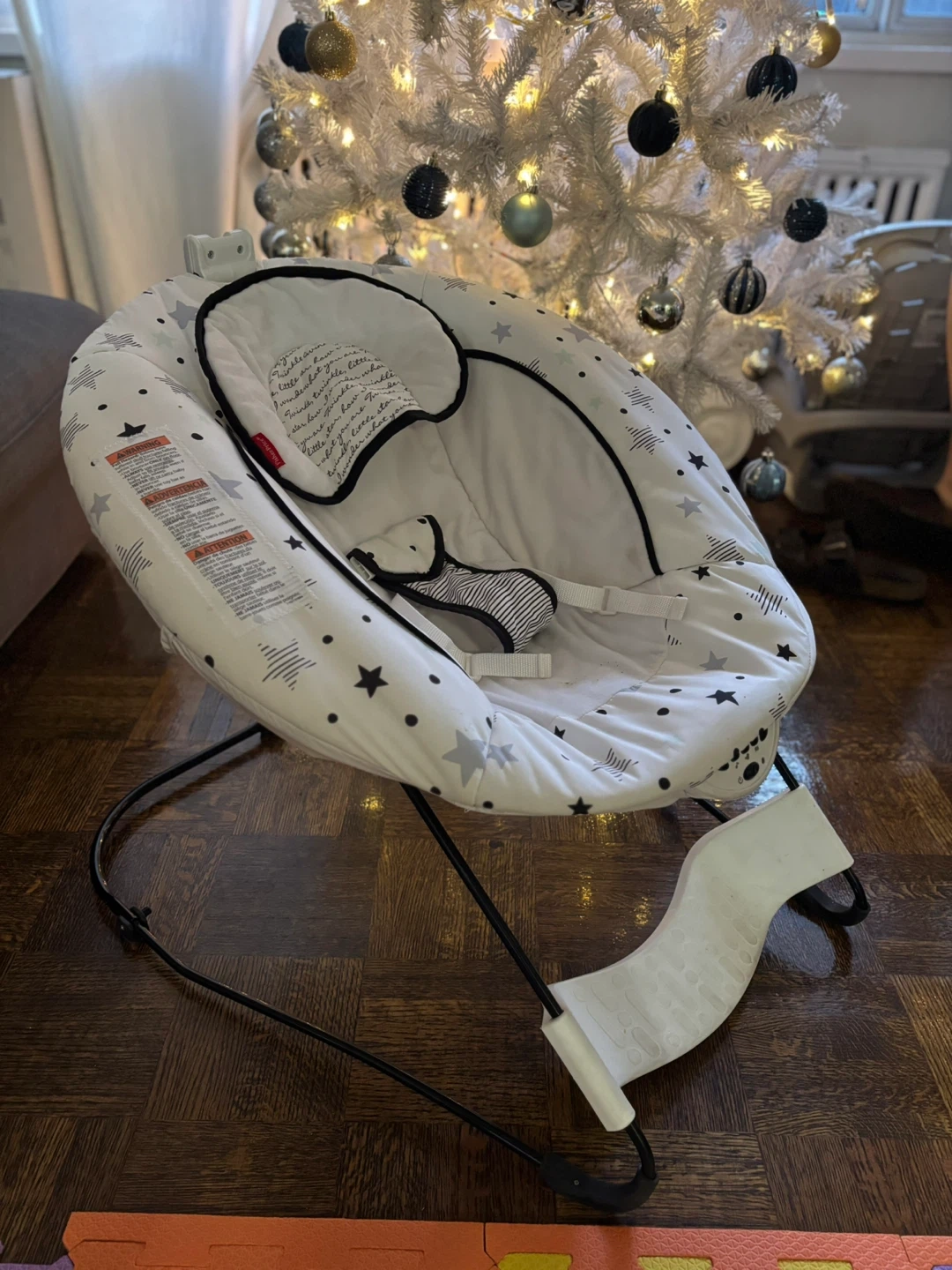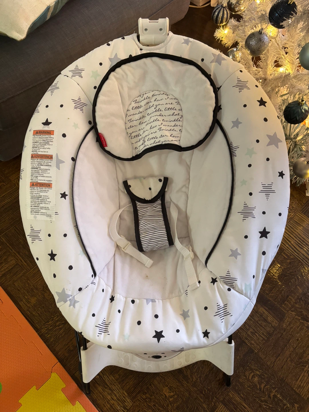 Selling a Fisher-Price baby bouncer in great condition! It features a cute star pattern and a comfortable design for your little one. Perfect for keeping baby entertained and relaxed.