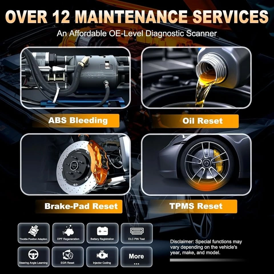 OM507 code reader features most commonly used reset functions to take care your daily maintenance. The functions include OIL Reset, Throttle Reset, EPB Reset, SAS Airbag Reset, Battery Register, ABS Bleeding, Injector Coding, TPMS Reset, Transmission Self-learning, Clear PCM Adaptive Value, Suspension Calibration, Steering Angle Calibration, Damper Stroke Calibration, DPF Regeneration, etc. Note: Feature availability may vary depending on your vehicle's year, make, and model.