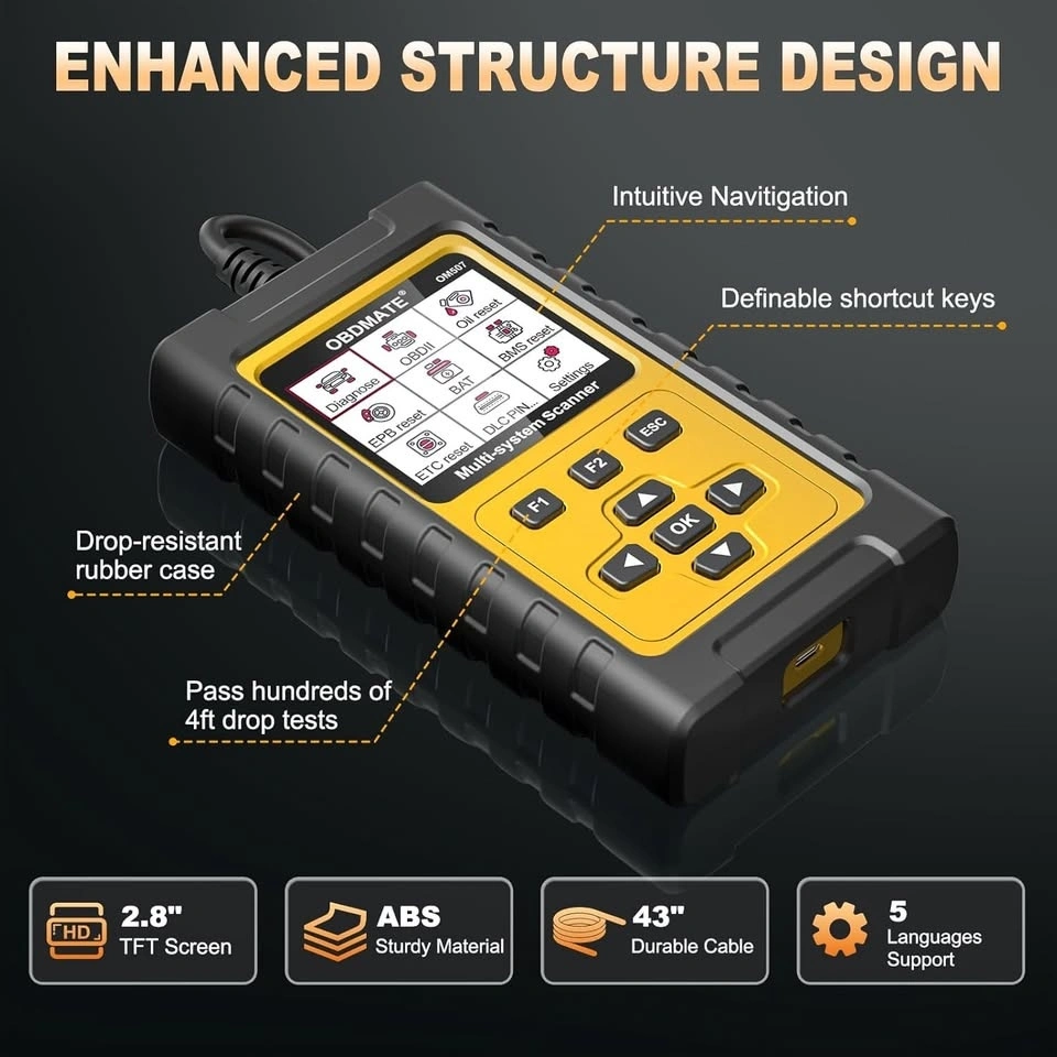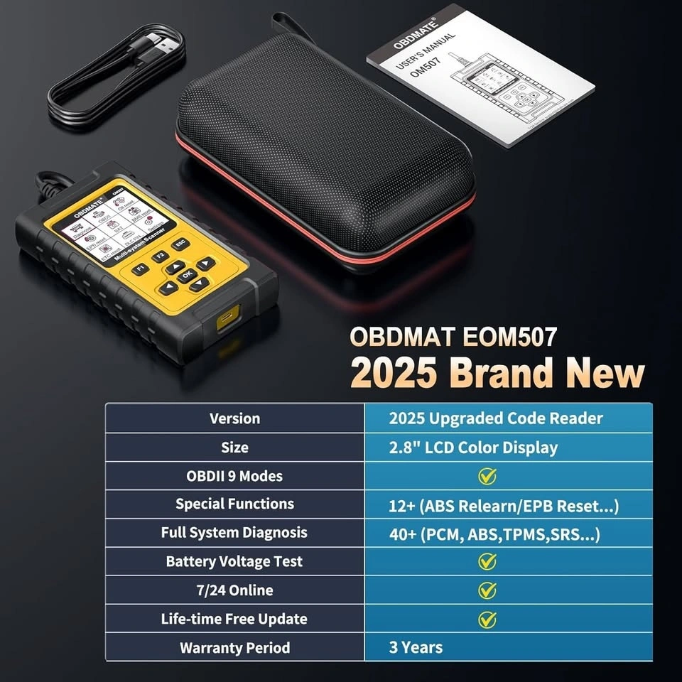 Compared to computer scanner, this 2.8" professional diagnostic scanner with resets displays clear readings of various sensors while keeping a handheld using experience. With its plug-and-play design, the OM507 requires no complex setup, quickly gets diagnosis started without any batteries or updates. 1-Min quickly scanning provides accurate results of all systems, helping you assess your vehicle's condition with ease.