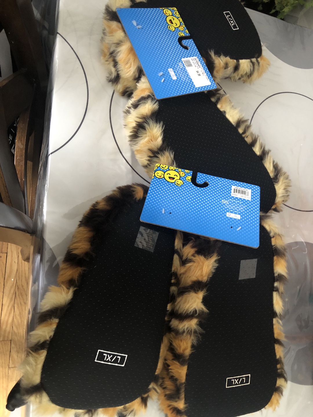 Cozy up with these fun Feetmoji tiger paw slippers! They're a size L/XL and feature a cool tiger stripe pattern with black claw details. Perfect for lounging around the house!