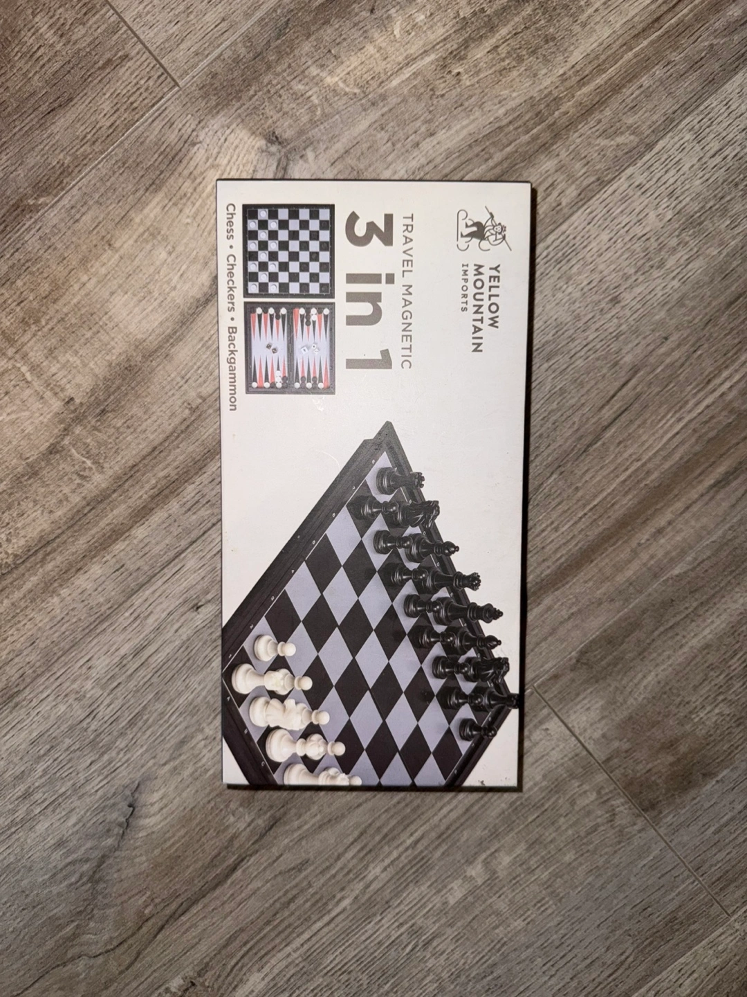 Selling a Yellow Mountain Imports 3-in-1 travel magnetic game set. It includes chess, checkers, and backgammon! Great for family fun on the go, pick up by the Eaton Center!