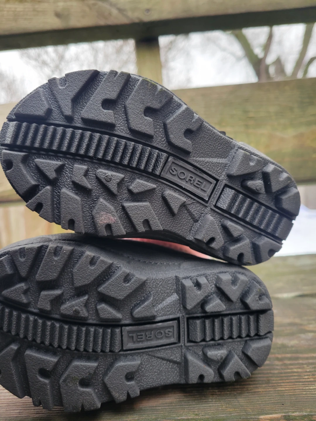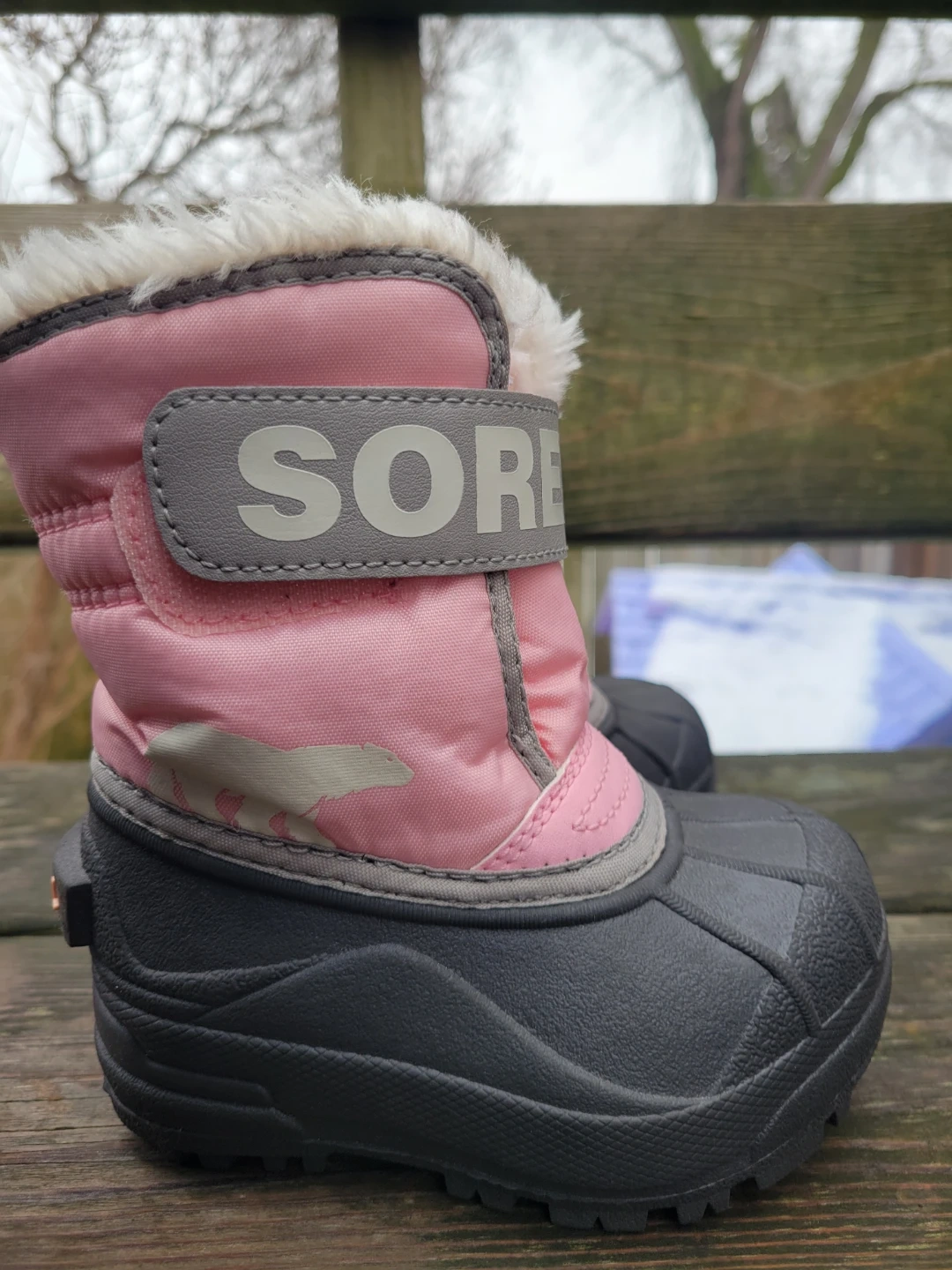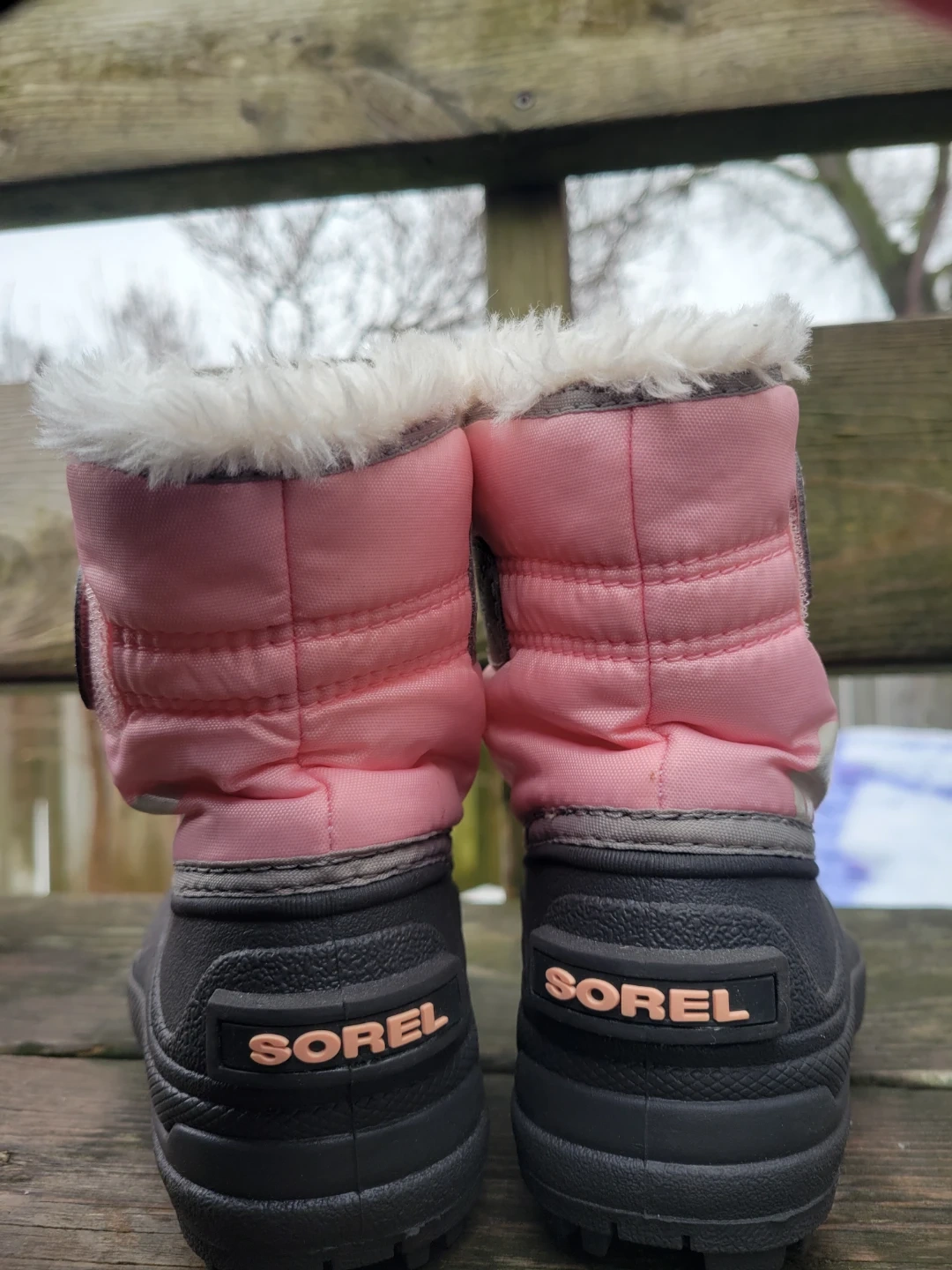 These adorable Sorel winter boots are perfect for keeping little feet warm and dry! They feature a cute pink and grey design with cozy faux fur trim. The size is a US 6. These boots are in great condition and ready for some snowy adventures!