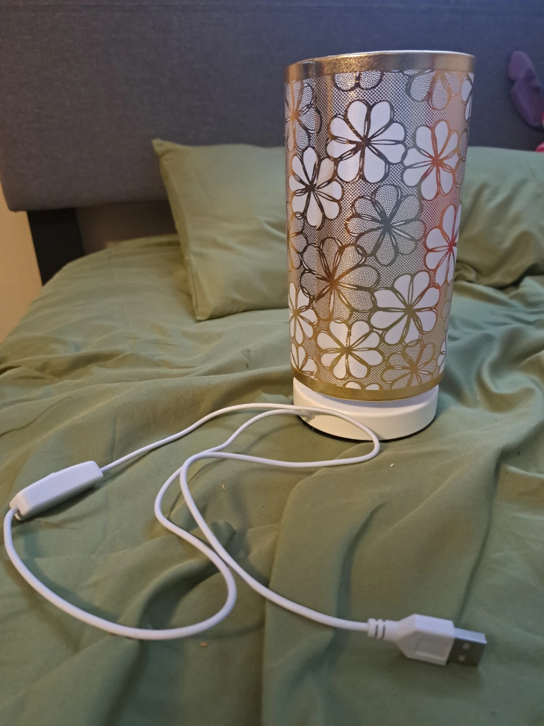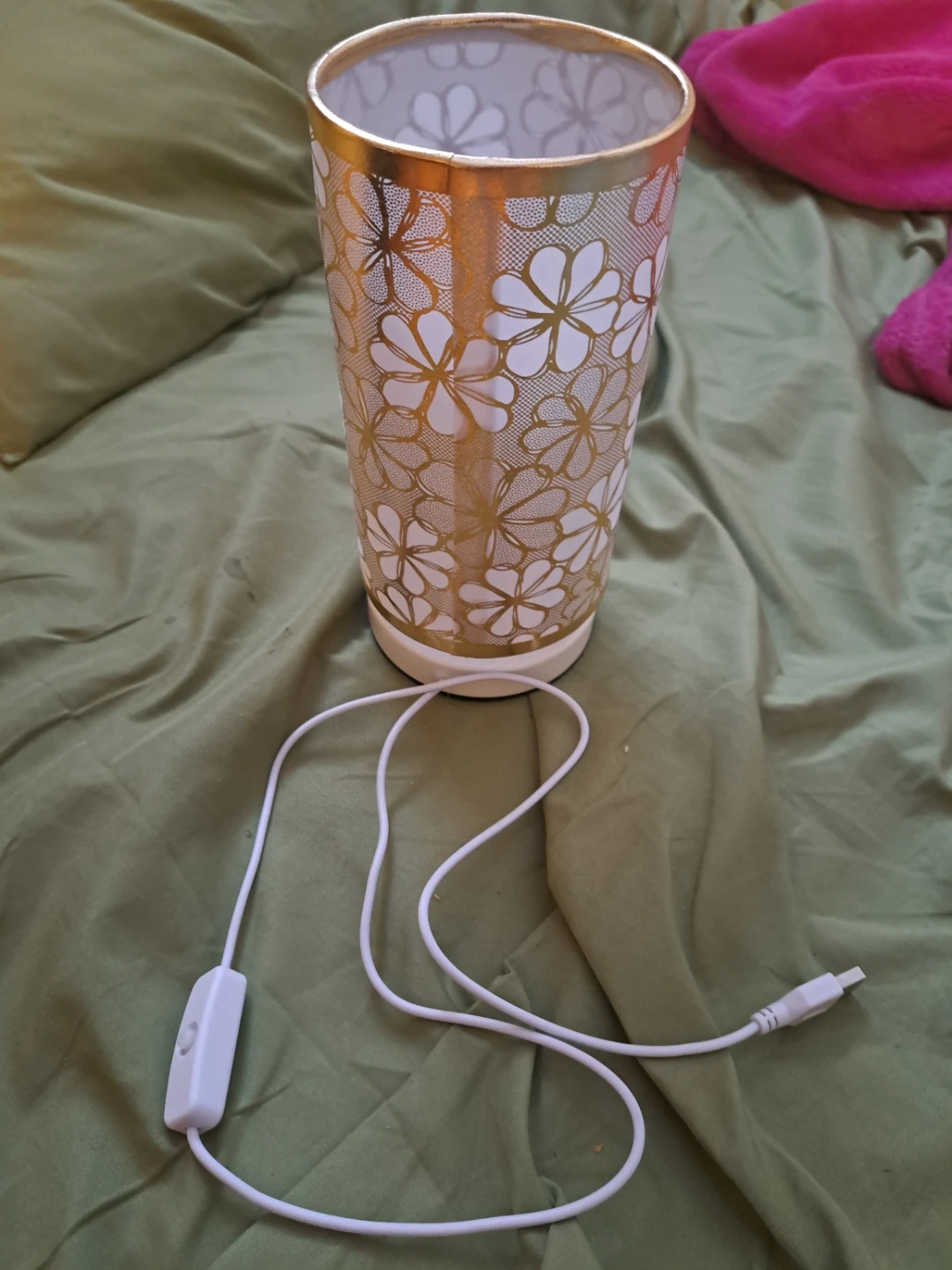 Here's a cute table lamp with a floral pattern! It has a gold and white design and is in great condition. It includes a USB cable with an on/off switch, making it super convenient for any room