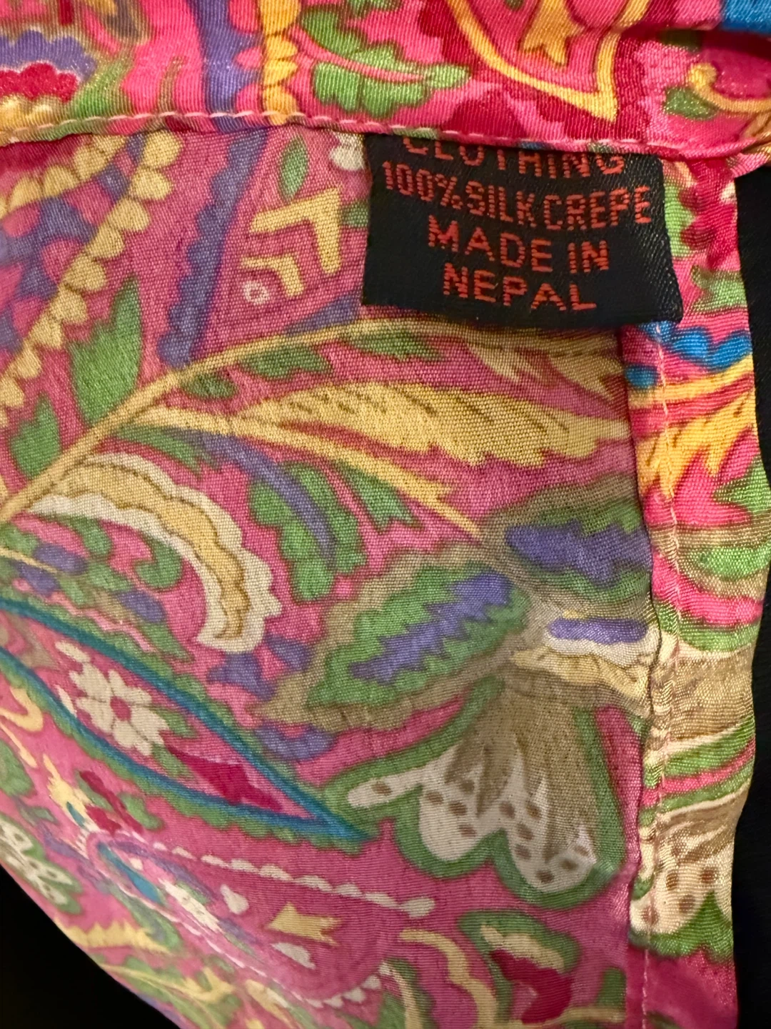 This is a beautiful skirt made of 100% silk crepe, crafted in Nepal. The vibrant paisley pattern features a mix of pink, green, yellow, and blue. It's a unique and eye-catching piece!