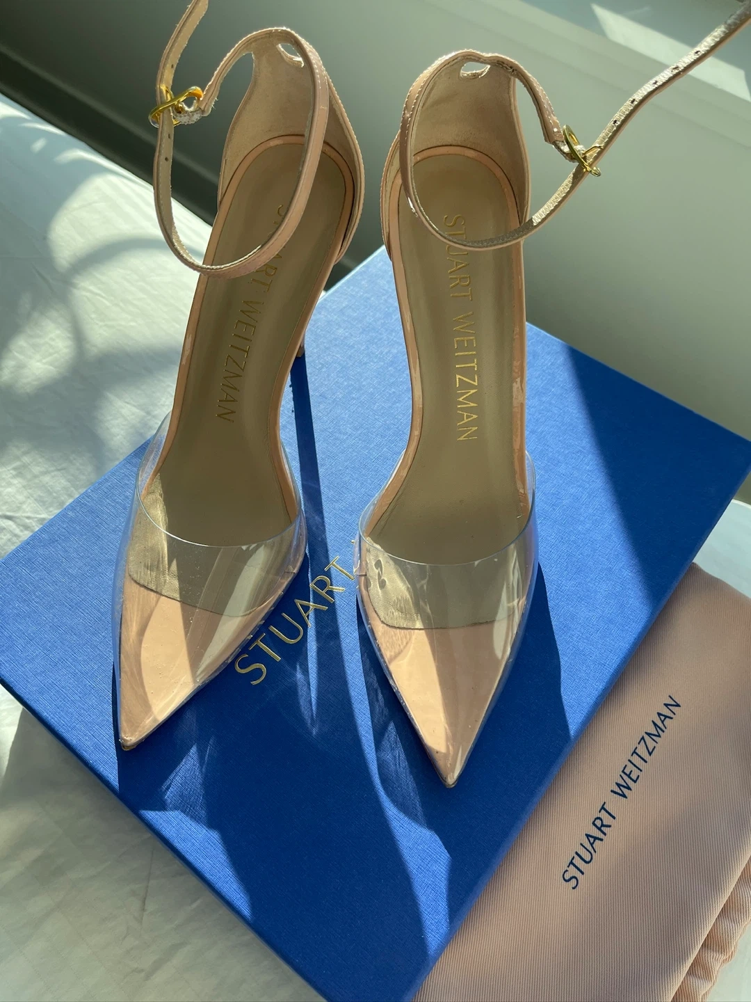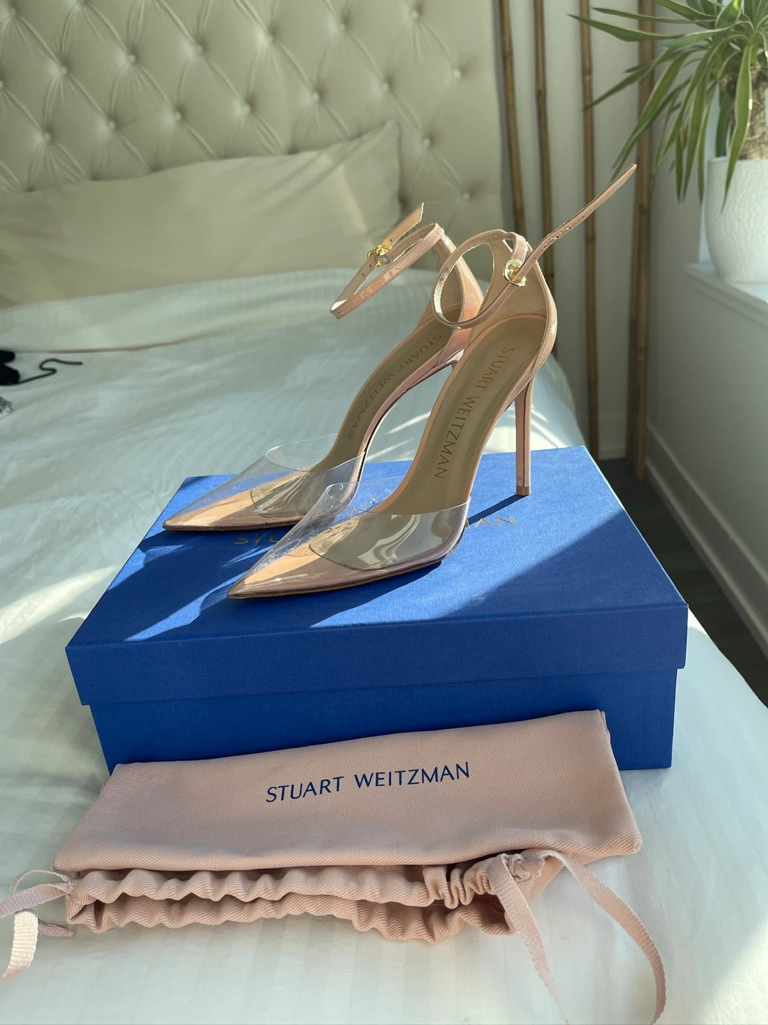 Stuart Weitzman heels are in excellent condition and come with the original box and dust bag! They are a beautiful nude colour with a clear PVC detail. Size 8