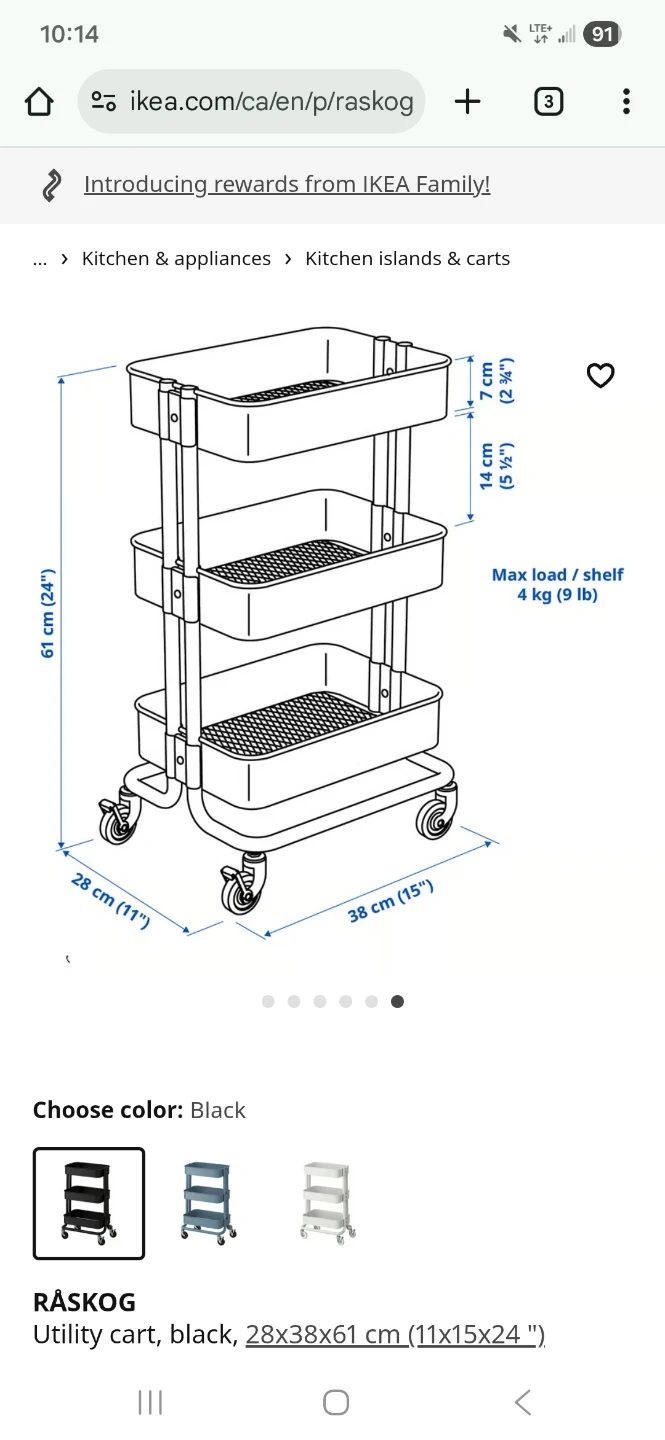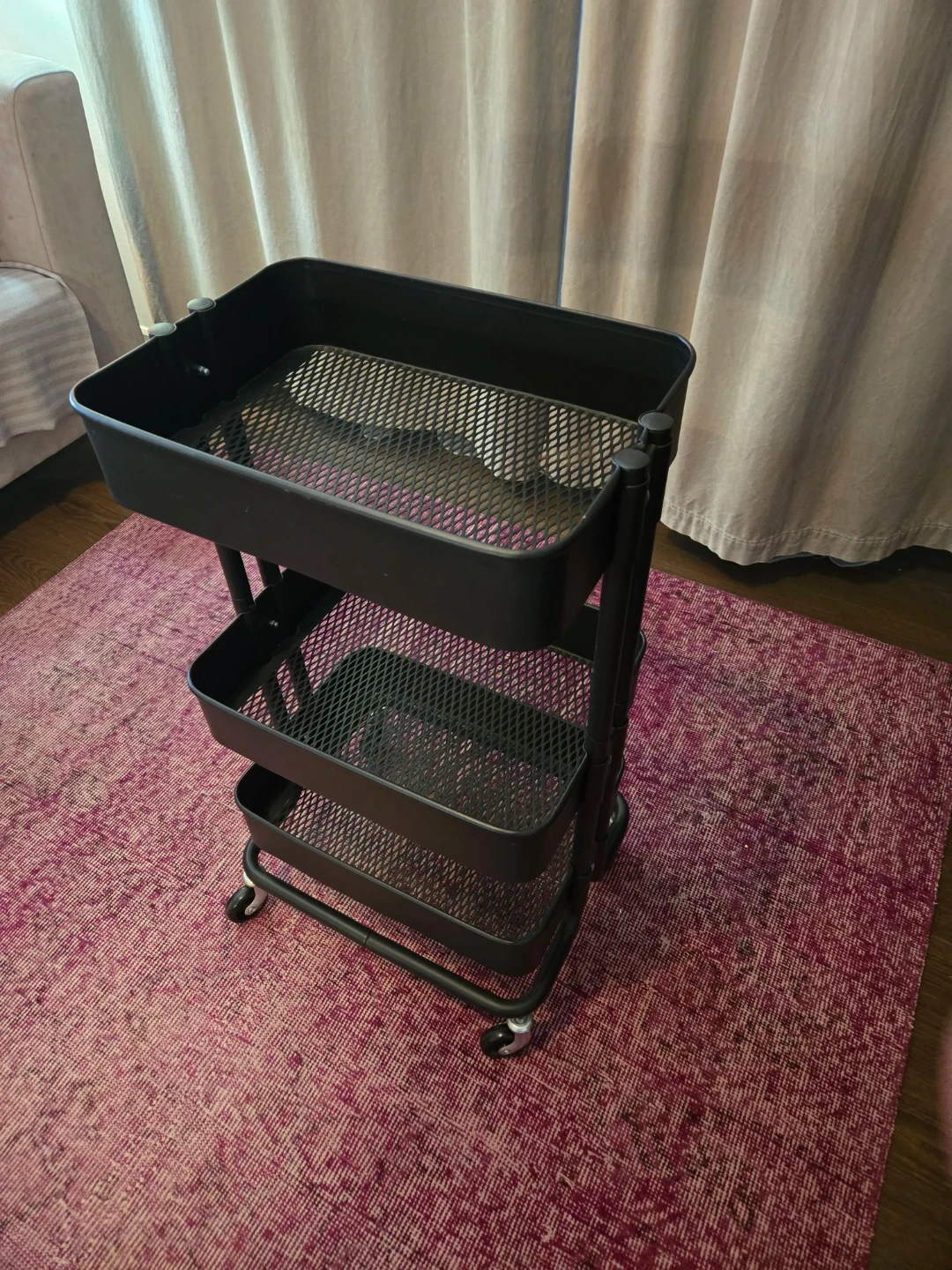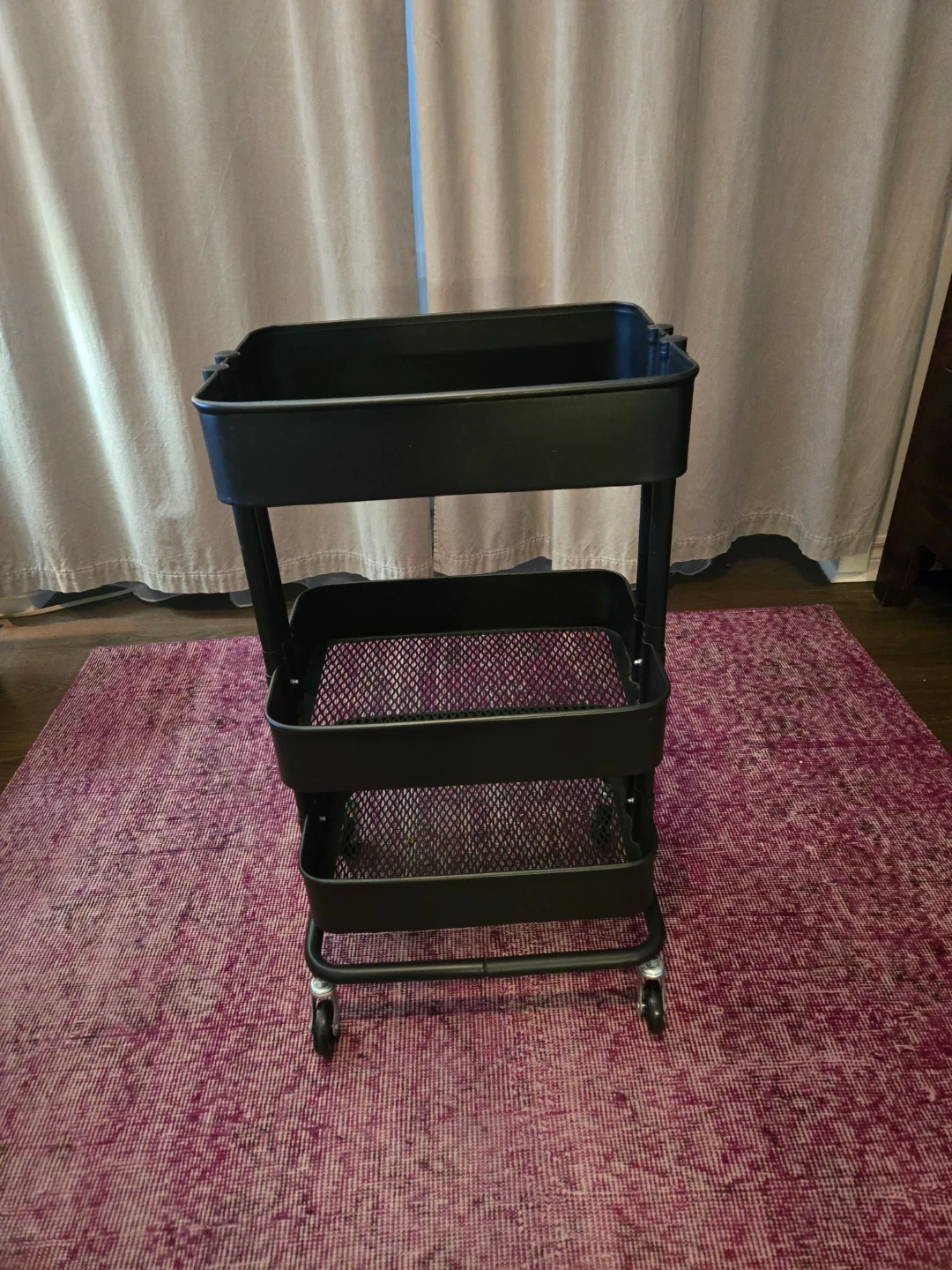 Selling a black IKEA RÅSKOG utility cart. It's in great shape and ready to help organize your space! The dimensions are 28x38x61 cm (11x15x24 "). Please note it does not have the locking feature on the wheels. Pick up only at Gerrard and Greenwood