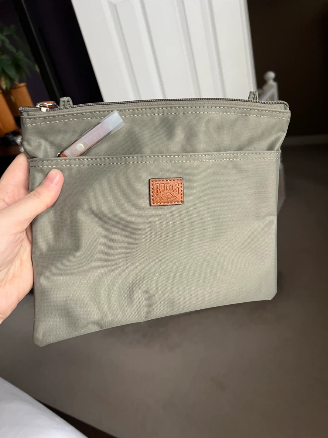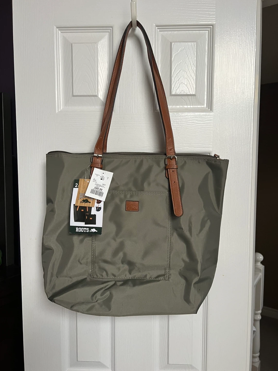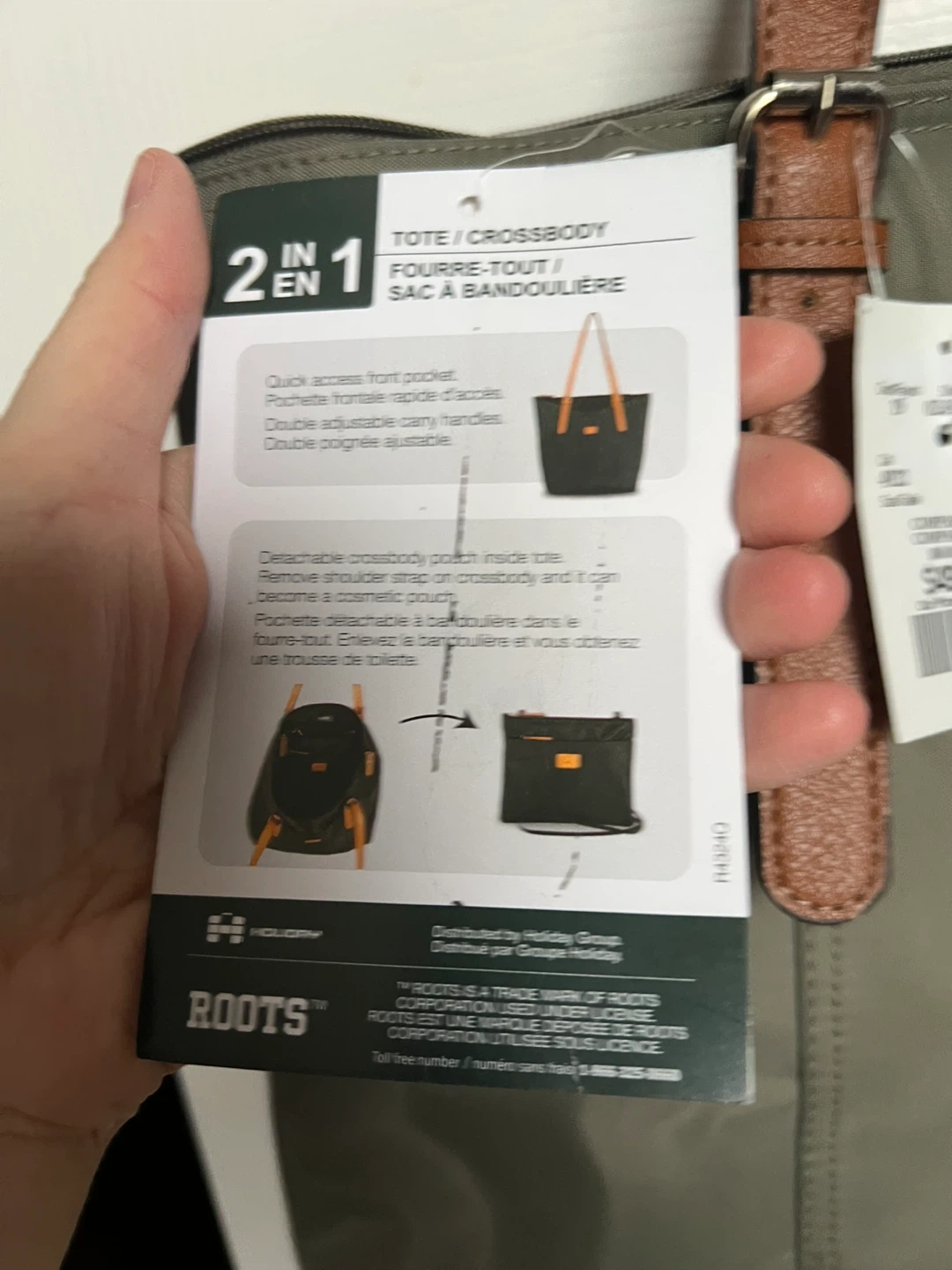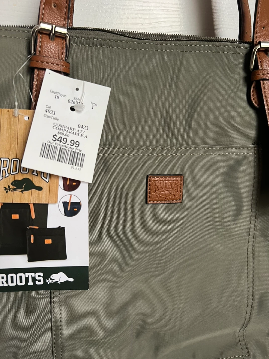 This is a Roots 2-in-1 tote bag is brand new with tags. It features a quick access front pocket and adjustable crossbody handles. The detachable crossbody pouch inside the tote can be removed and used as a cosmetic pouch. Originally priced at $49.99