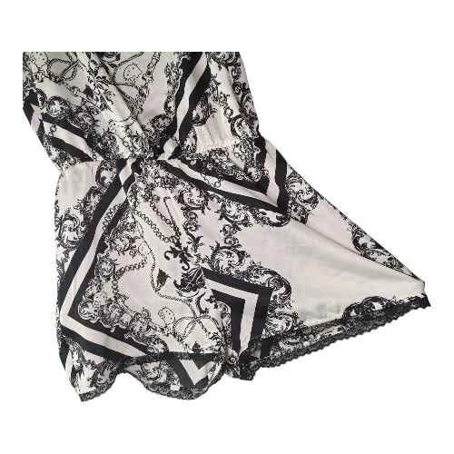 This Hello Kitty lingerie dress is presented in a black and white color scheme, with thin straps and a V-shaped neckline. The romper is crafted from a lightweight material, showcasing a hello kitty and geometric pattern. The design is characterized by a short, flowy silhouette.