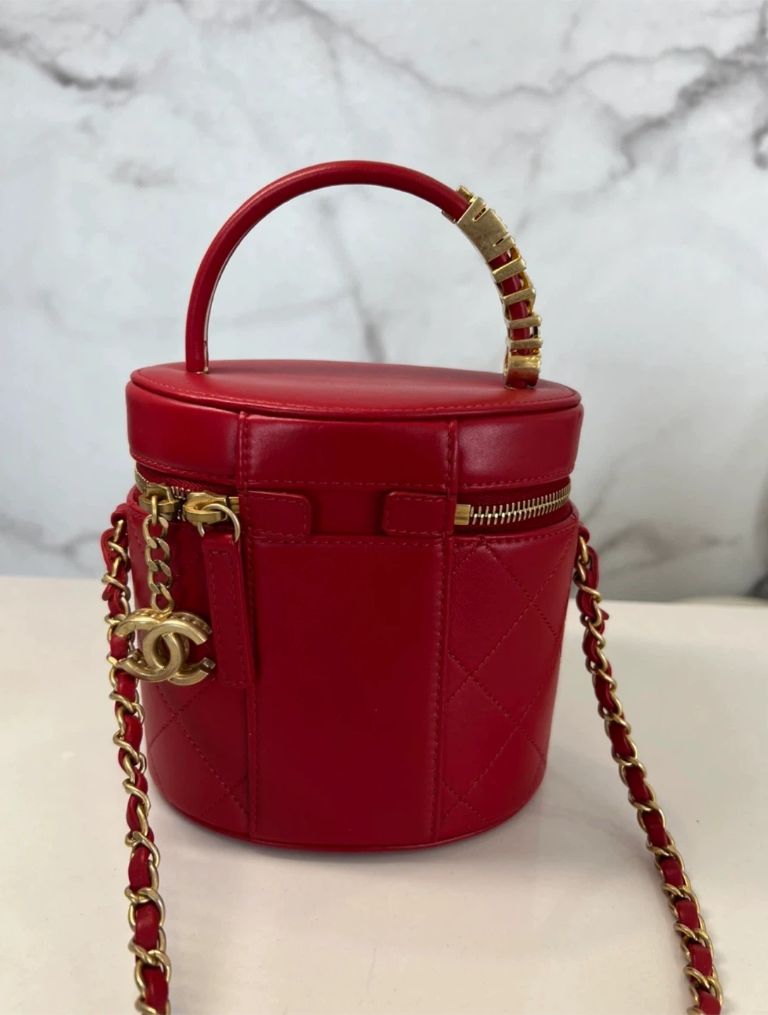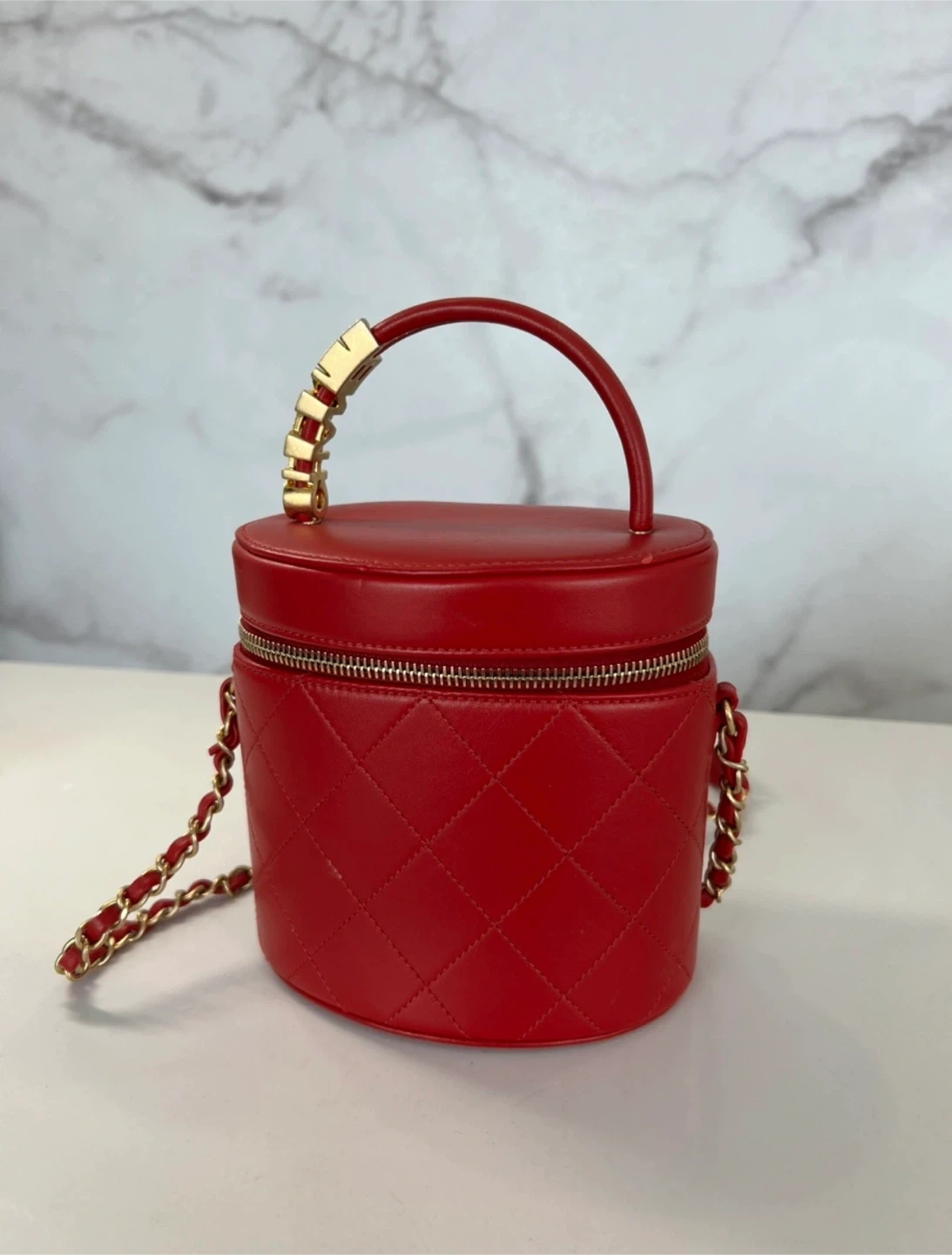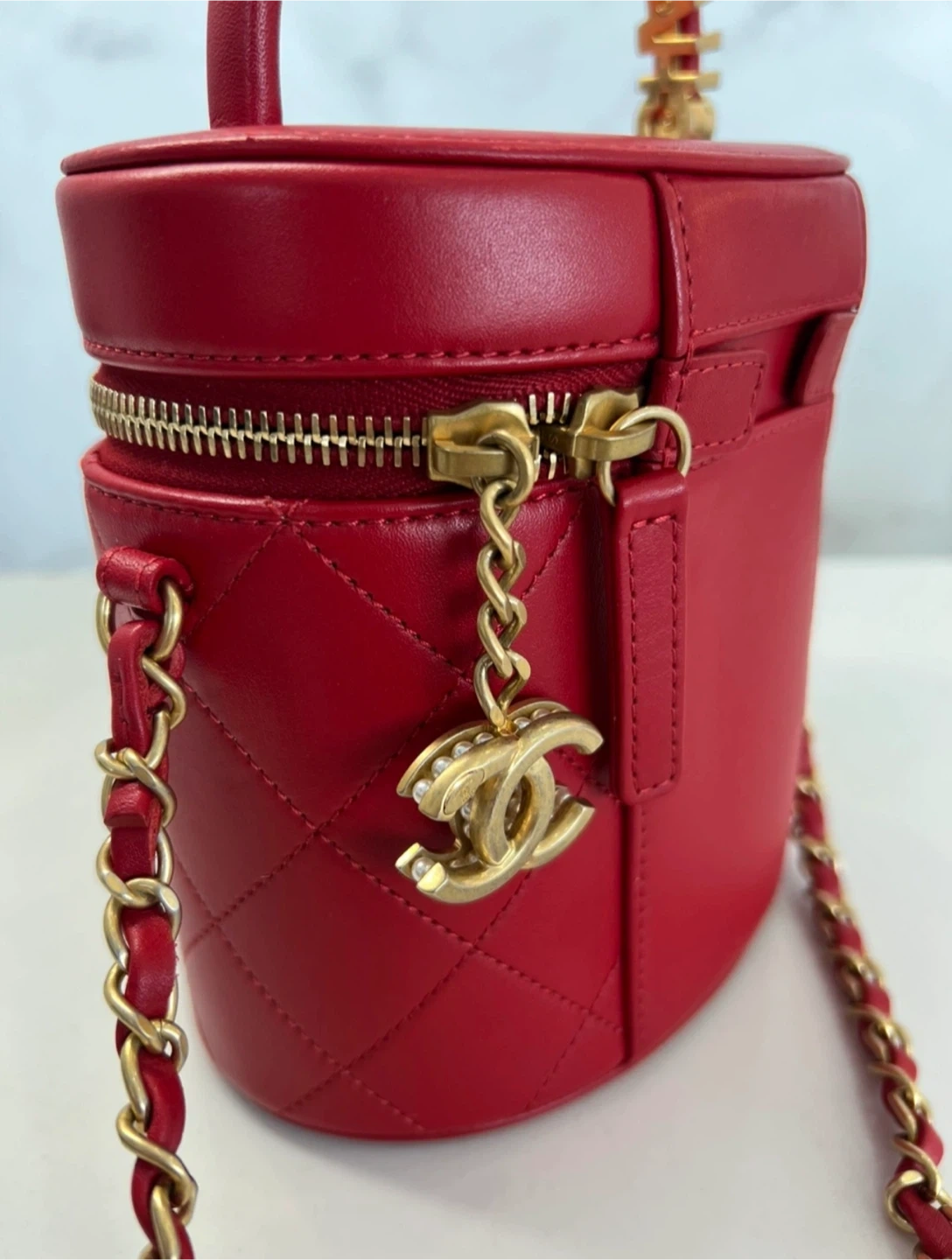 This is a beautiful Chanel red cylinder vanity bag! It's in great condition and features the classic Chanel diamond quilting. The handle has the Chanel logo on it, adding a touch of elegance. Perfect for carrying your essentials in style