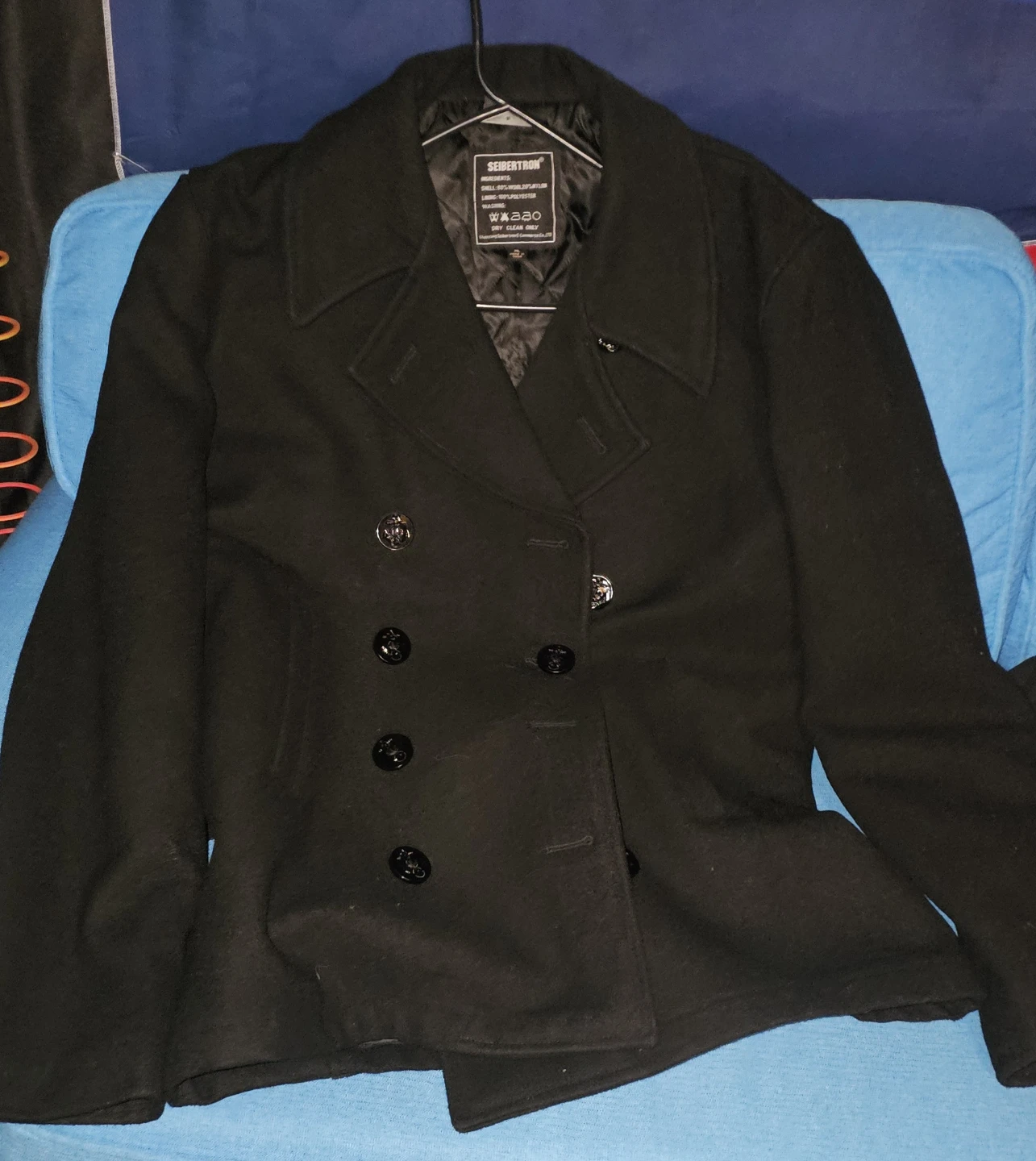 Selling a Seibertron pea coat in size XL! It's a classic black colour and made with a blend of 80% wool and 20% nylon for the shell, with a 100% polyester lining. Dry clean only to keep it looking its best