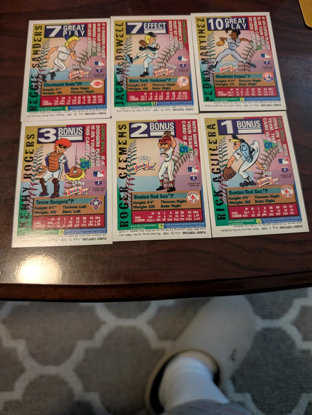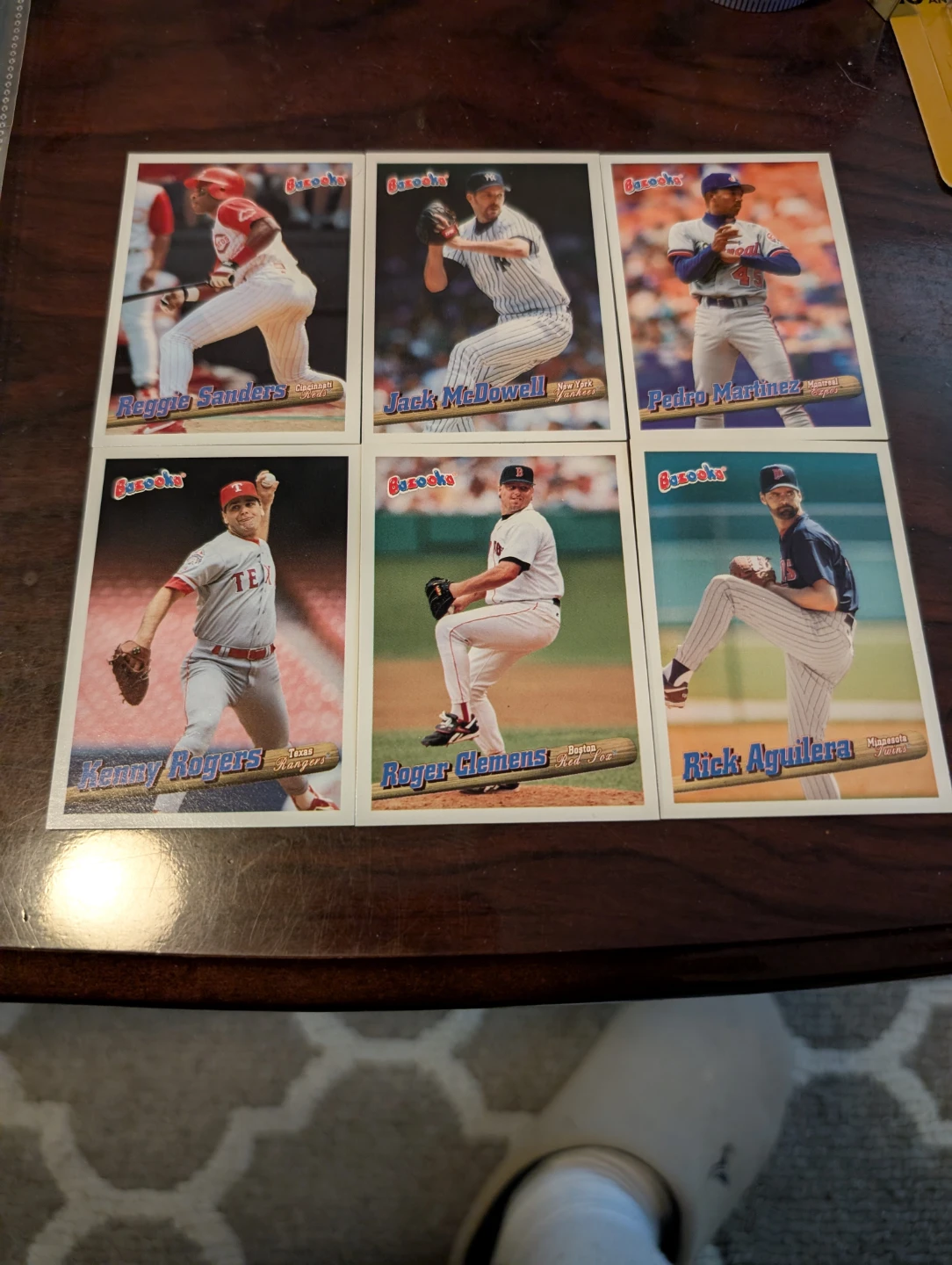 Selling a set of 1996 Bazooka baseball cards. The cards feature players like Reggie Sanders, Jack McDowell, Pedro Martinez, Kenny Rogers, Roger Clemens, and Rick Aguilera. A great addition to any baseball card collection!