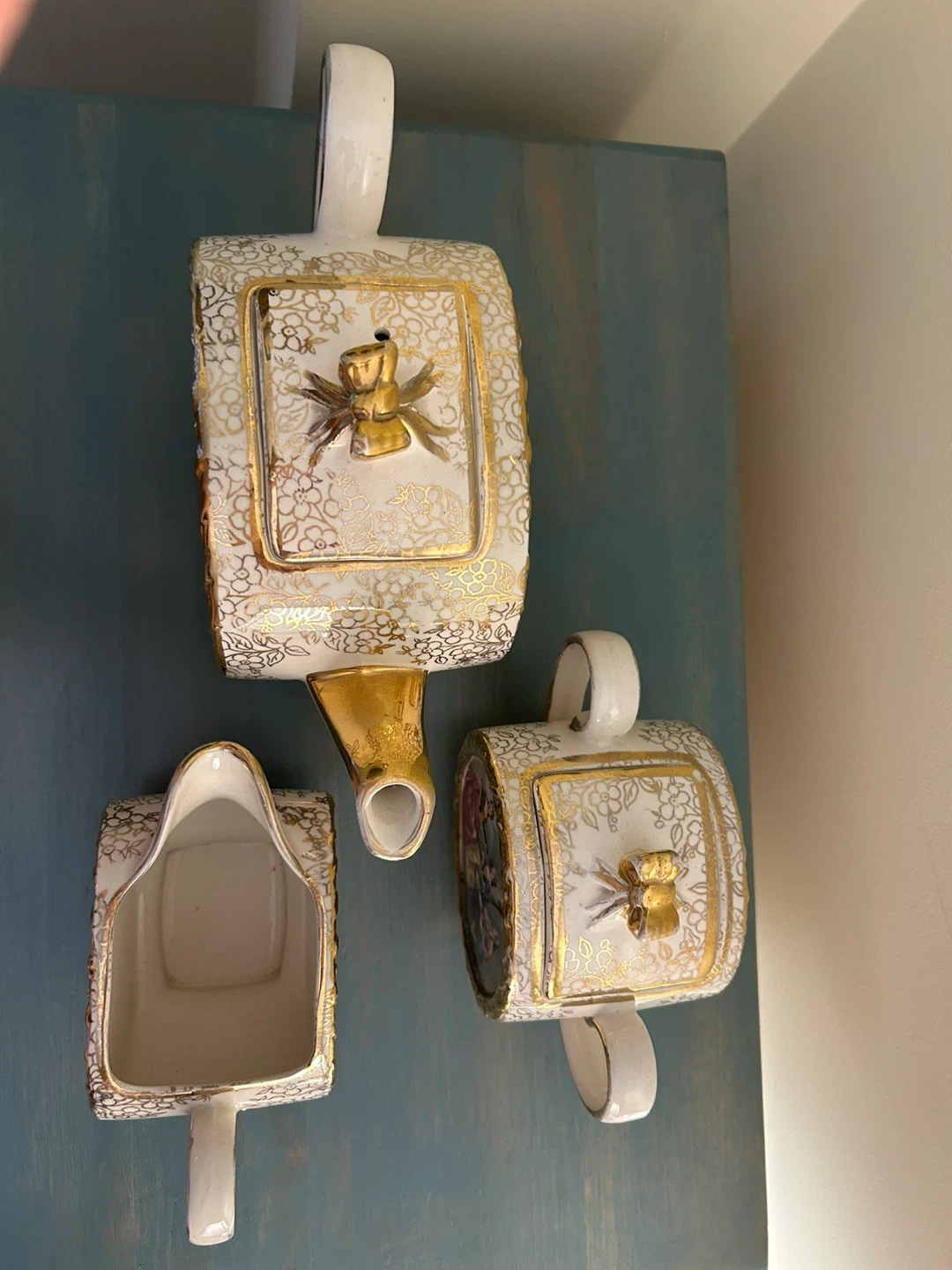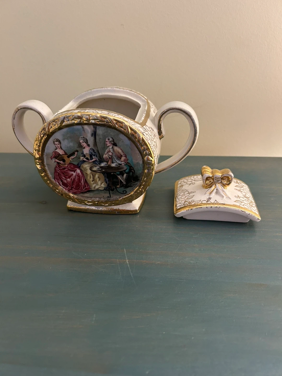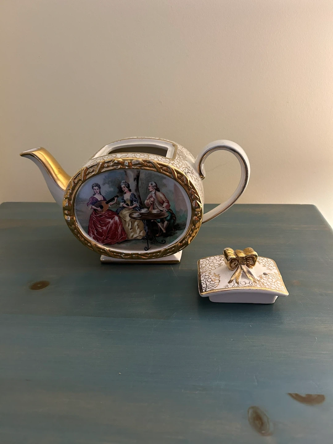 James Sadler Cherub Tea Set 1940’s Barrel Tea Pot, Creamer & Sugar Bowl. Gold accents with English ladies in gowns tied ribbon on handle. There are two small chips in the sugar bowl other wise all pieces are in great condition. Tea Pot 5”high x 9”wide x3/4”deep.