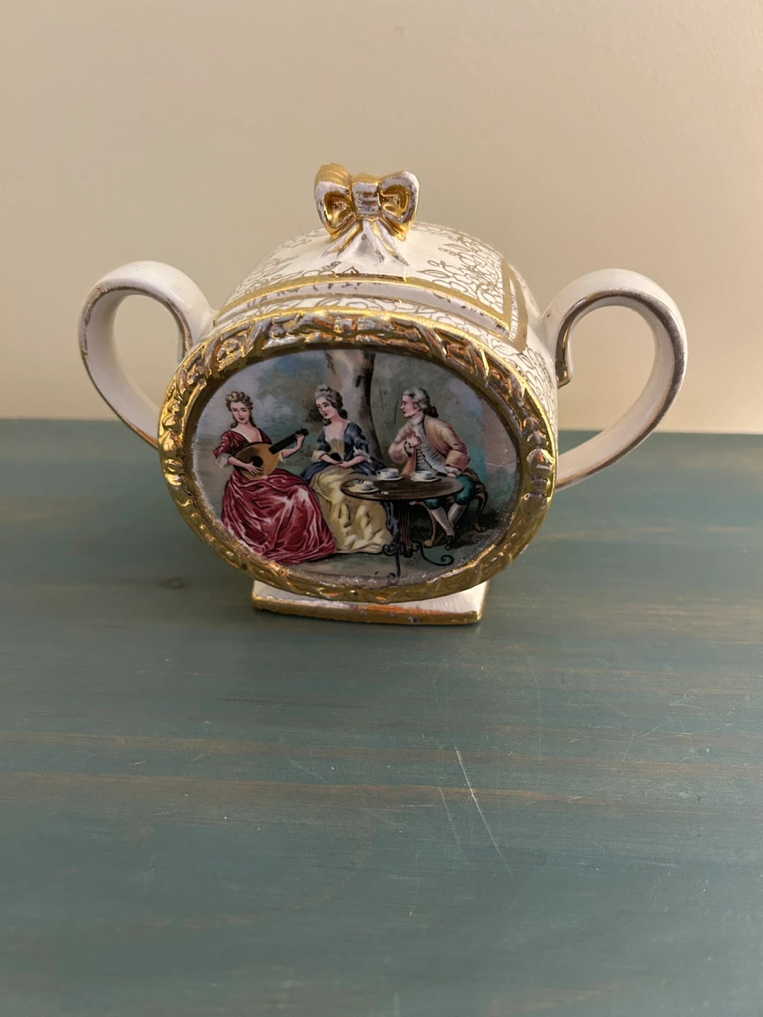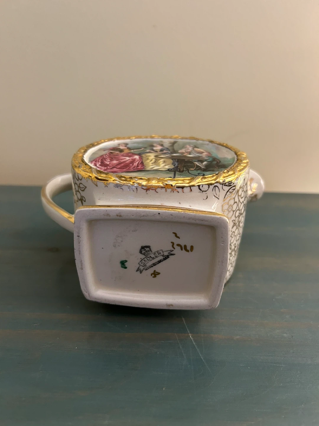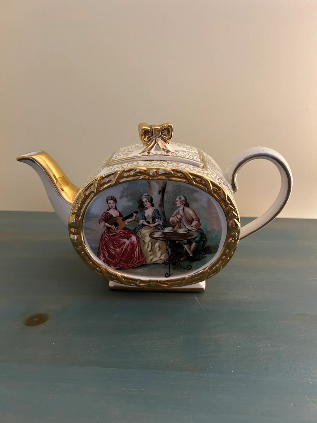 James Sadler Cherub Tea Set 1940’s Barrel Tea Pot, Creamer & Sugar Bowl. Gold accents with English ladies in gowns tied ribbon on handle. There are two small chips in the sugar bowl other wise all pieces are in great condition. Tea Pot 5”high x 9”wide x3/4”deep.