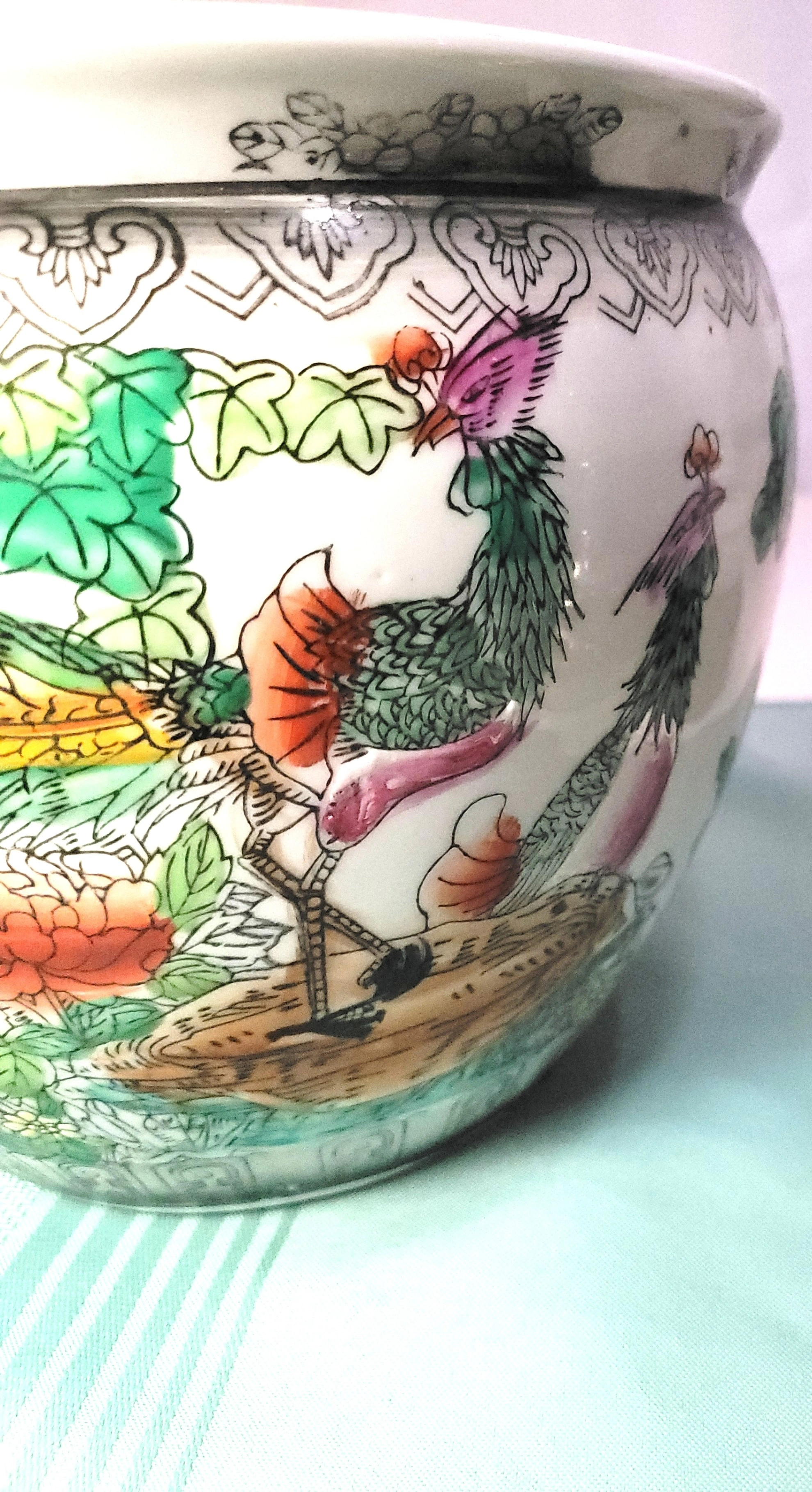 Description: This is a beautiful, heavy vintage Chinese porcelain planter featuring a classic Famille Rose style "Bird and Flower" design. The exterior is decorated with vibrant hand-painted pheasants perched on rockwork surrounded by lush pink peonies and floral foliage. The rim is finished with a decorative geometric border.