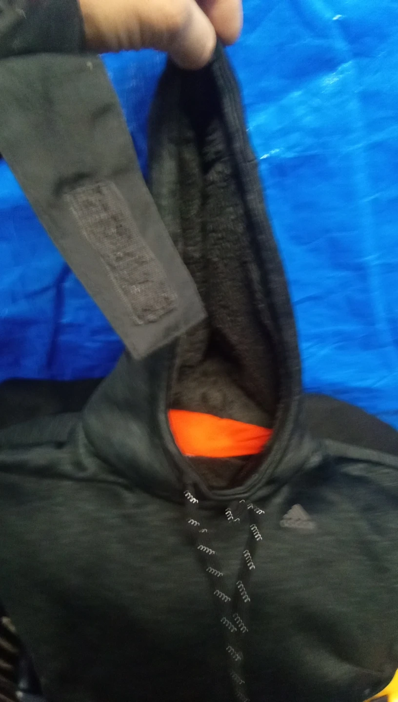 Selling a black Adidas hoodie. It has a gray heathered pattern on the outside and a bright orange lining in the hood. There is a zipper pocket on the side.