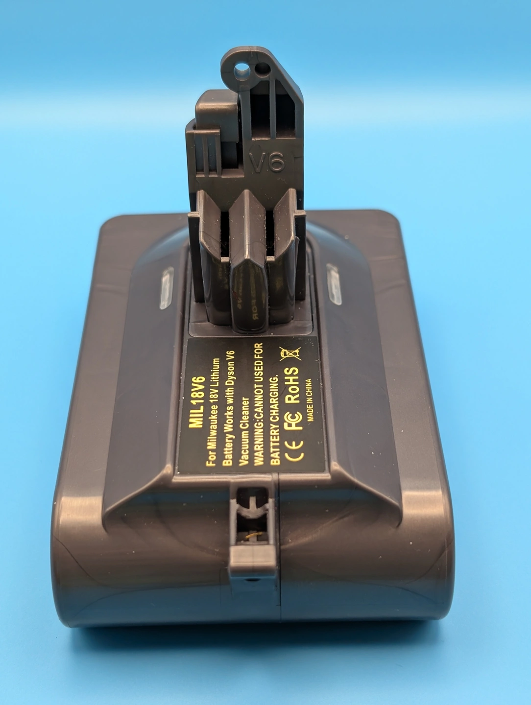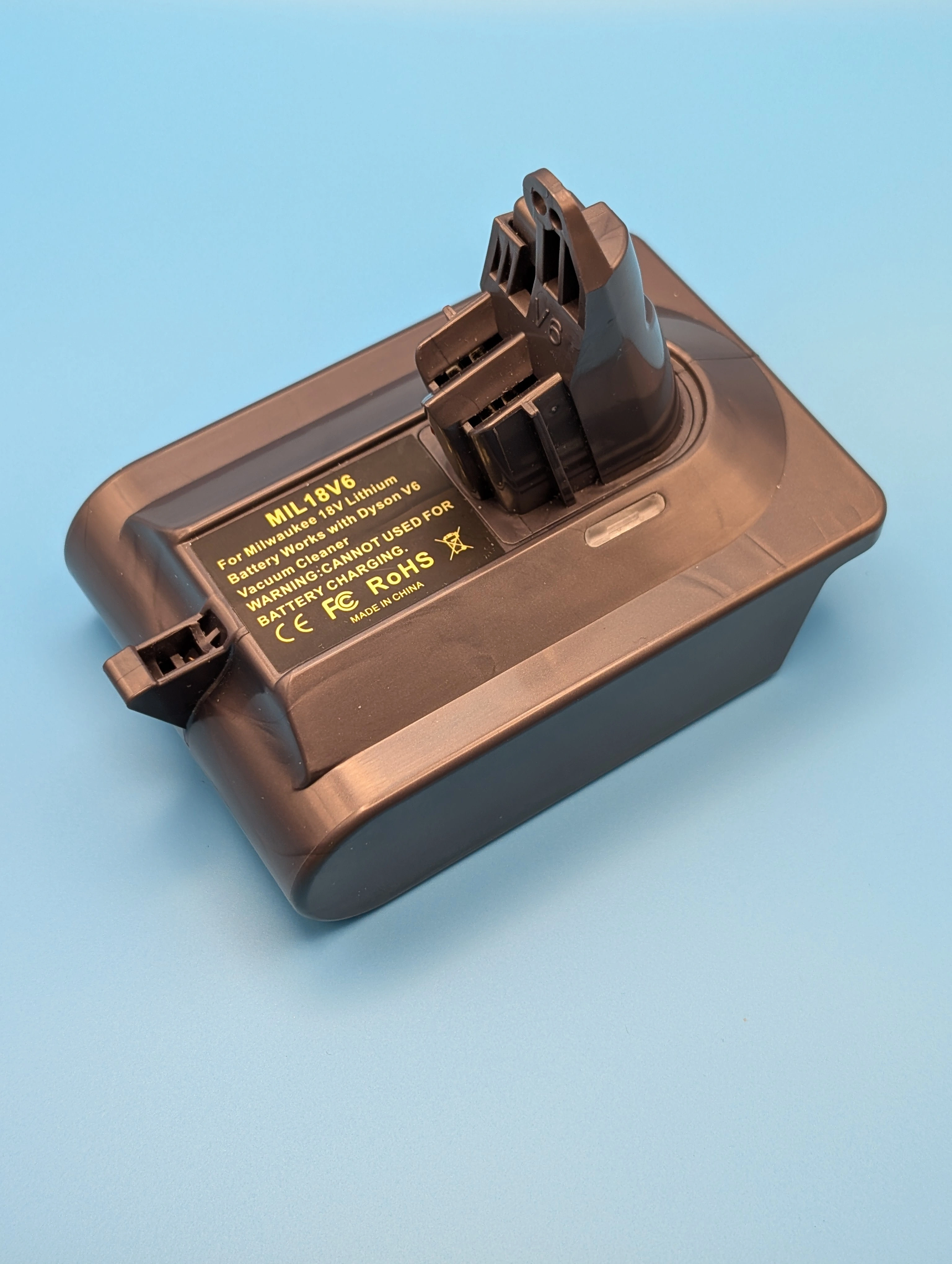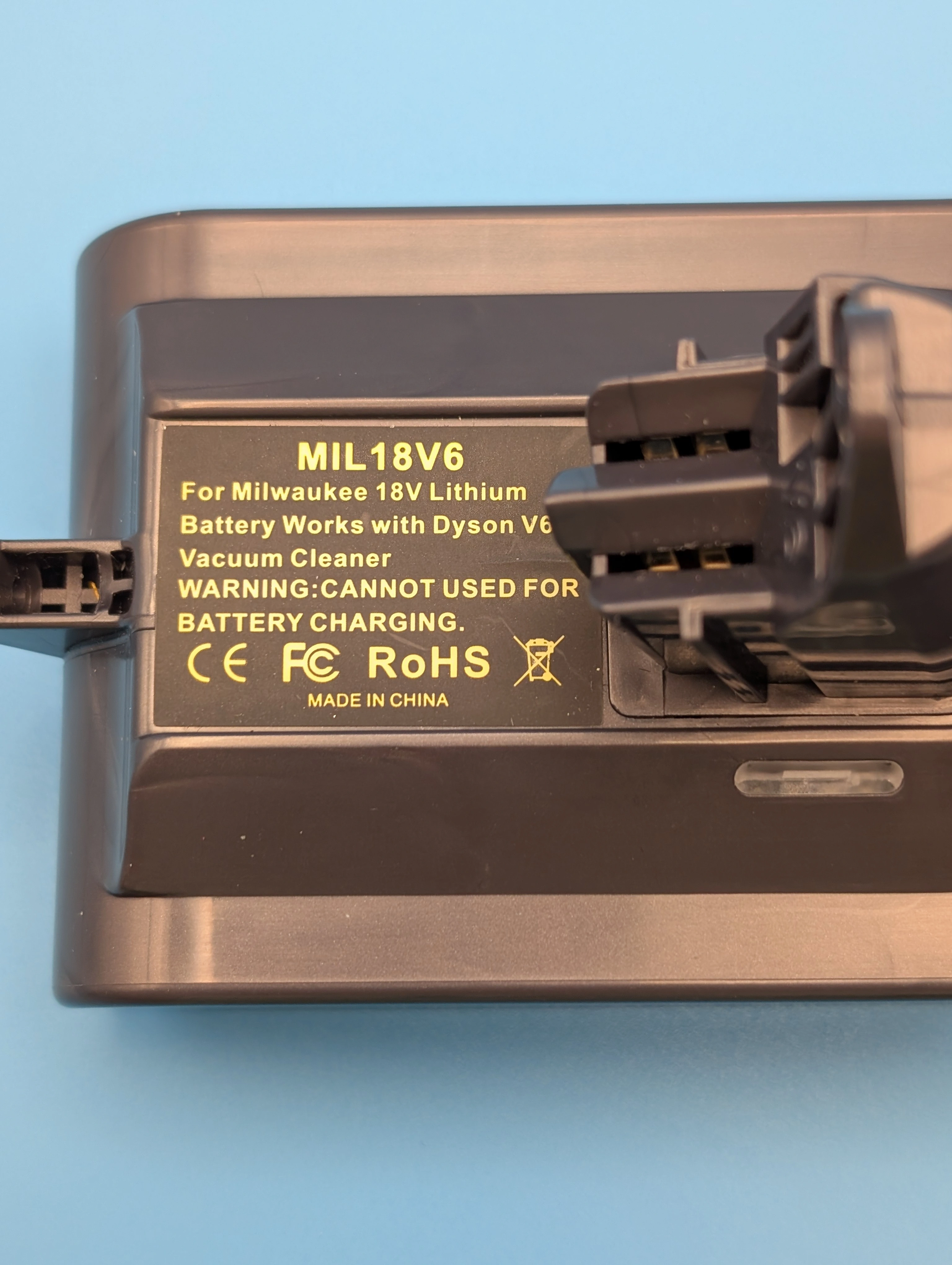 This will allow you to use a Milwaukee 18V Battery to power a Dyson V6 vacuum cleaner.