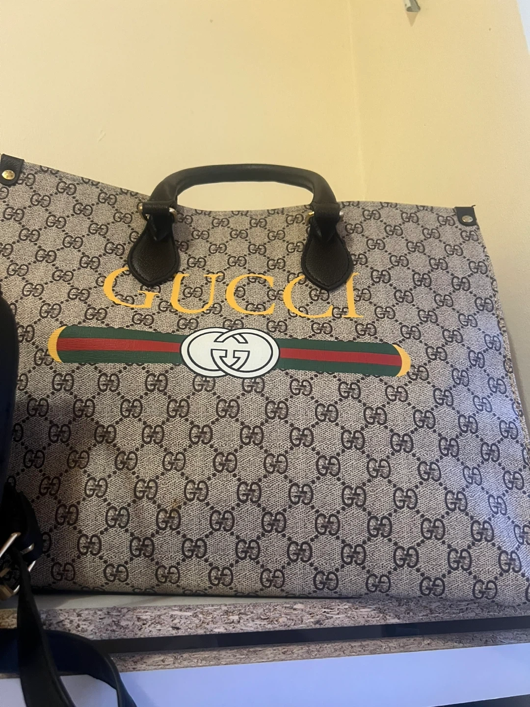 Selling a Gucci tote bag with the classic Gucci pattern and detailing. It's in great condition and ready for a new owner!