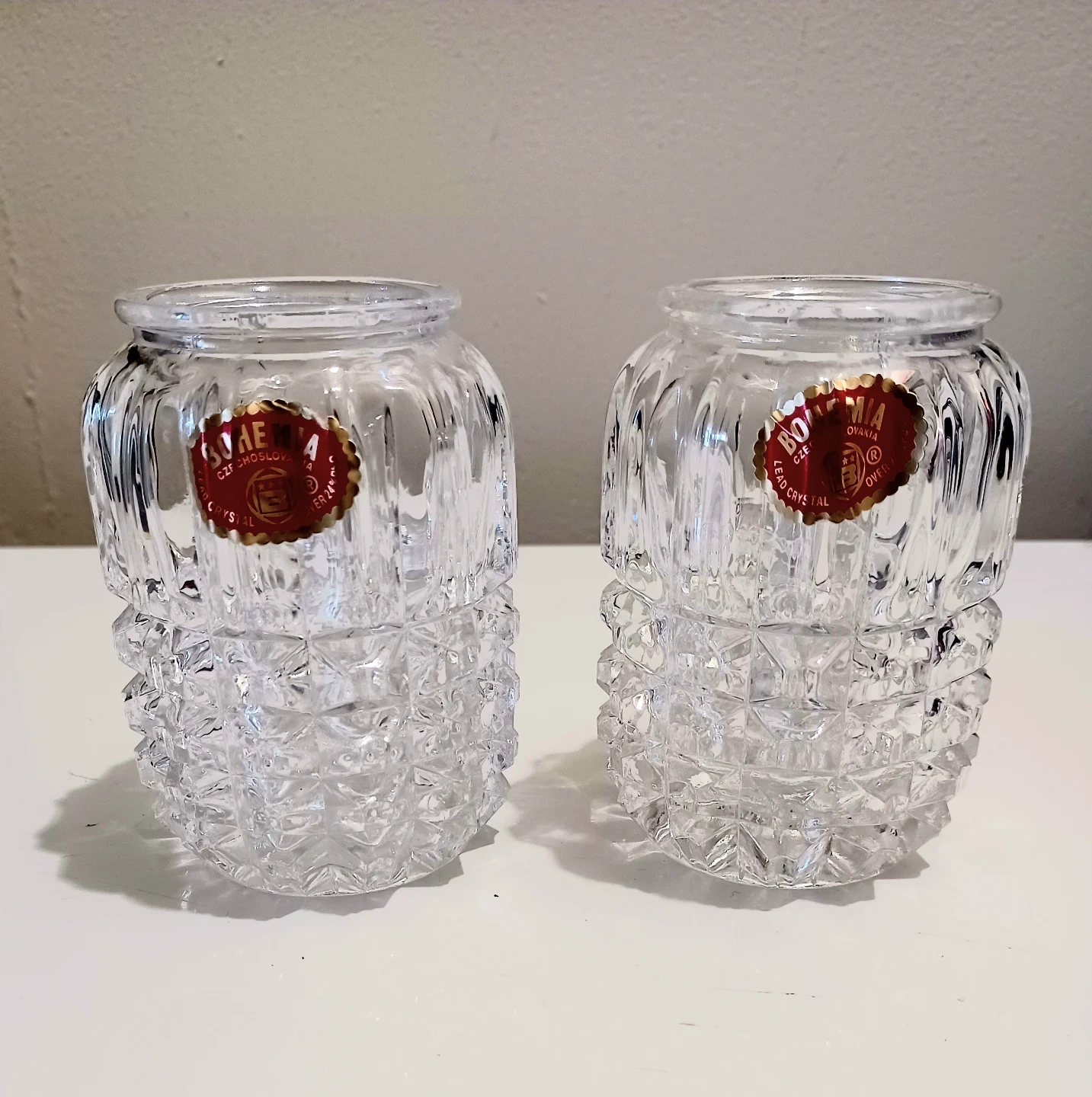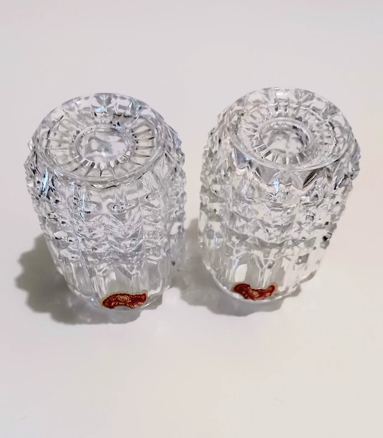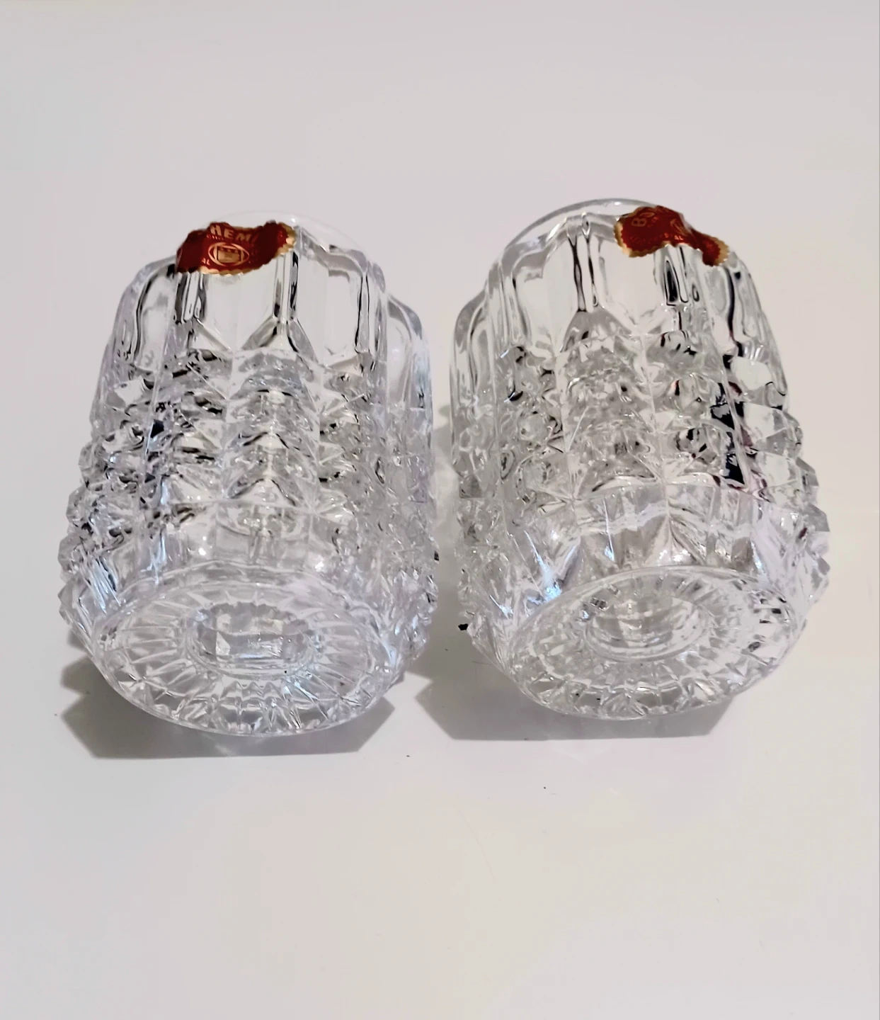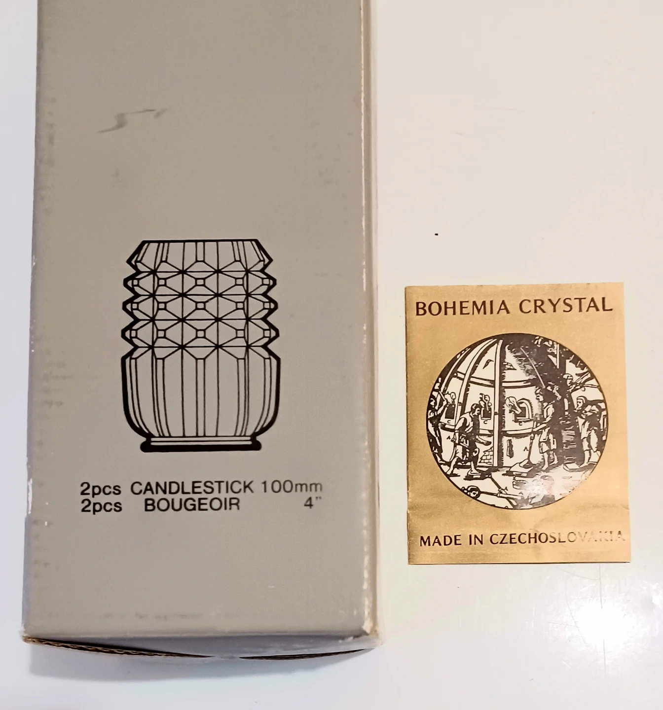 These are a Pair of Exquisite Bohemia Crystal candle holders, each standing 4 inches tall and featuring a Stunning, Intricate Cut-crystal design. These candle holders are in Excellent condition, with the original Bohemia Crystal stickers still attached, a testament to their Authenticity . Also included is the original box and leaflet.