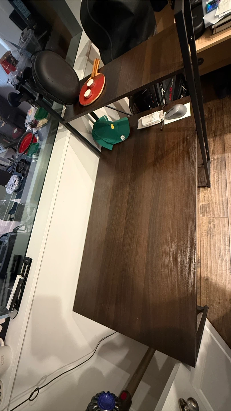 Selling a sturdy, modern desk with a dark brown wooden top and metal frame.
