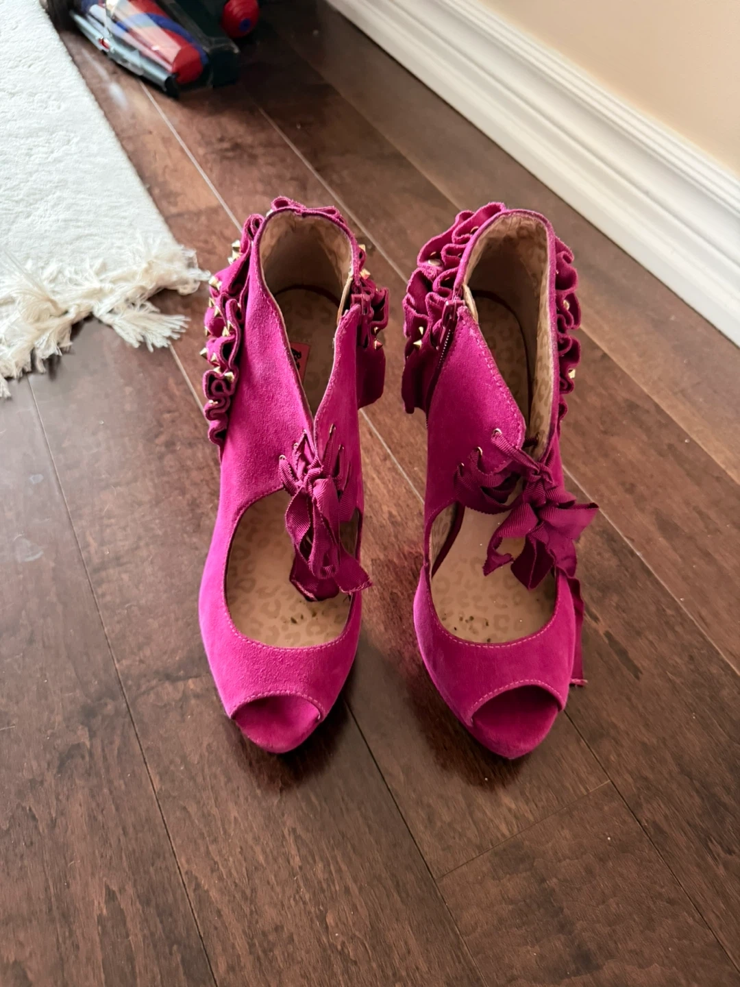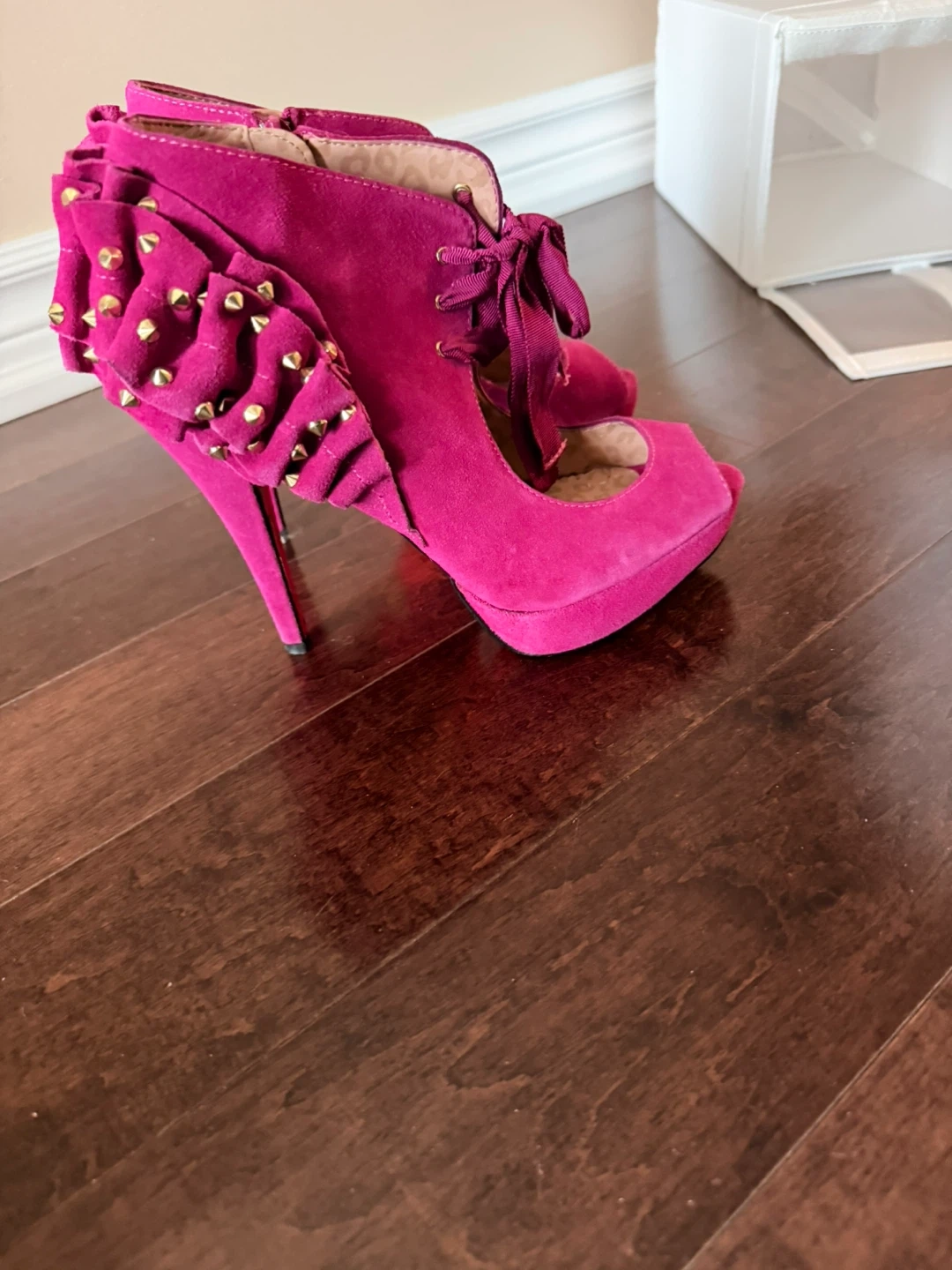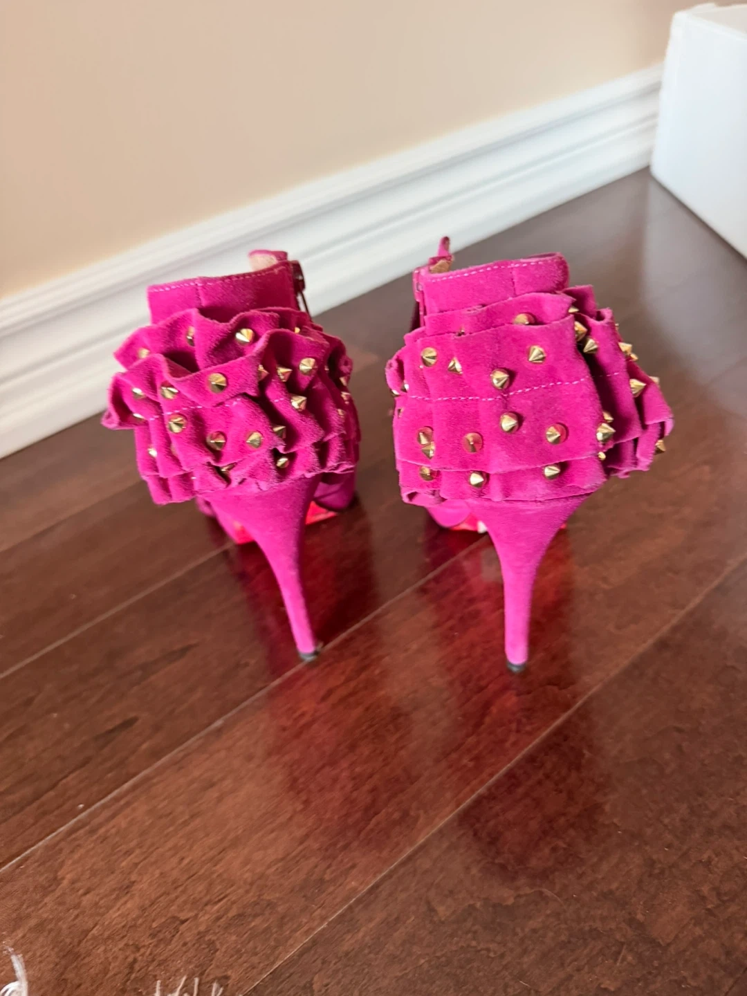 These vibrant pink Betsey Johnson heels are sure to make a statement! They feature a unique ruffle design with gold studs and a stylish peep toe. The shoes are a size 9 and made of soft suede material. Perfect for adding a pop of colour to any outfit!