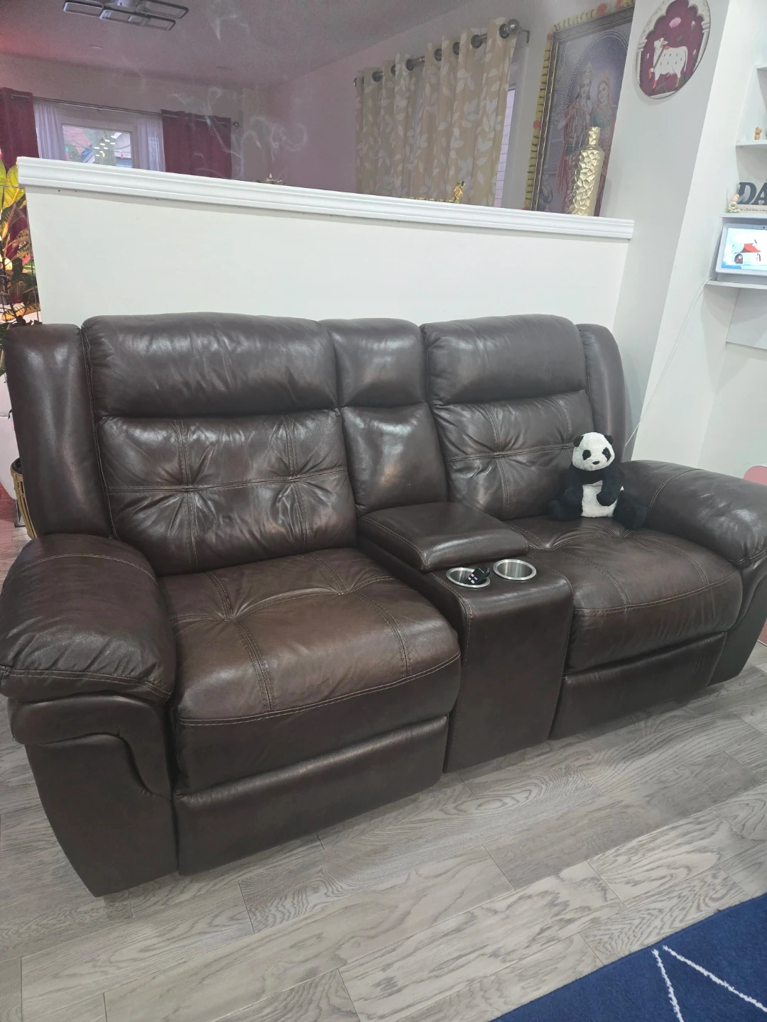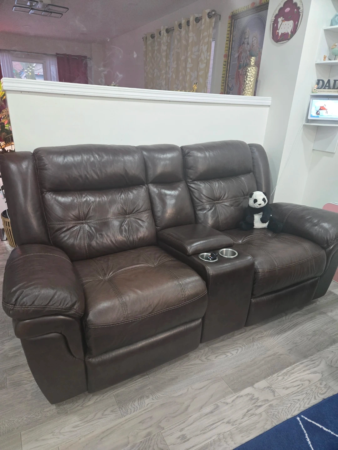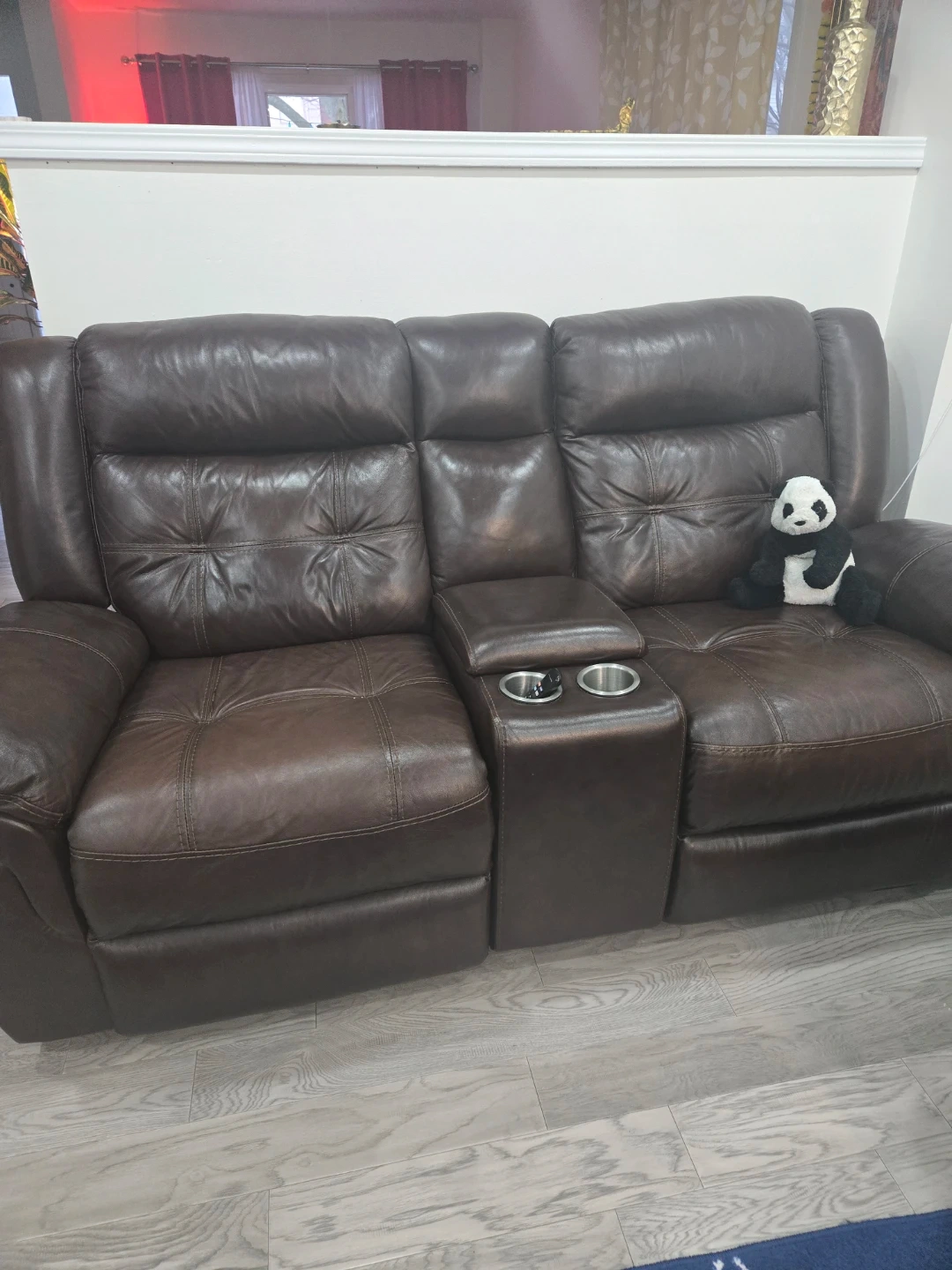 Selling a brown leather reclining sofa set. Includes a three-seater sofa and a two-seater sofa with a console and cupholders. It is in excellent condition.