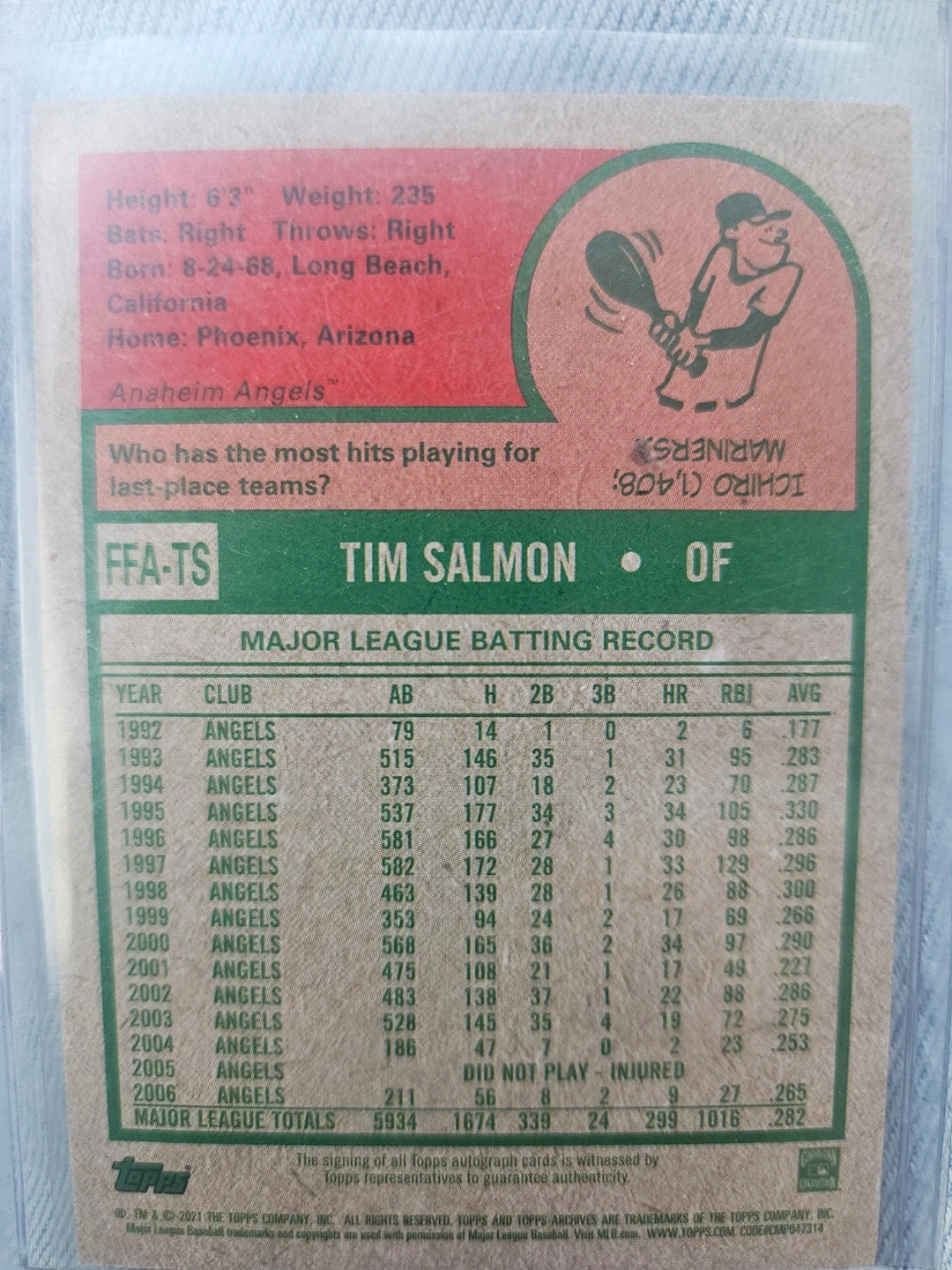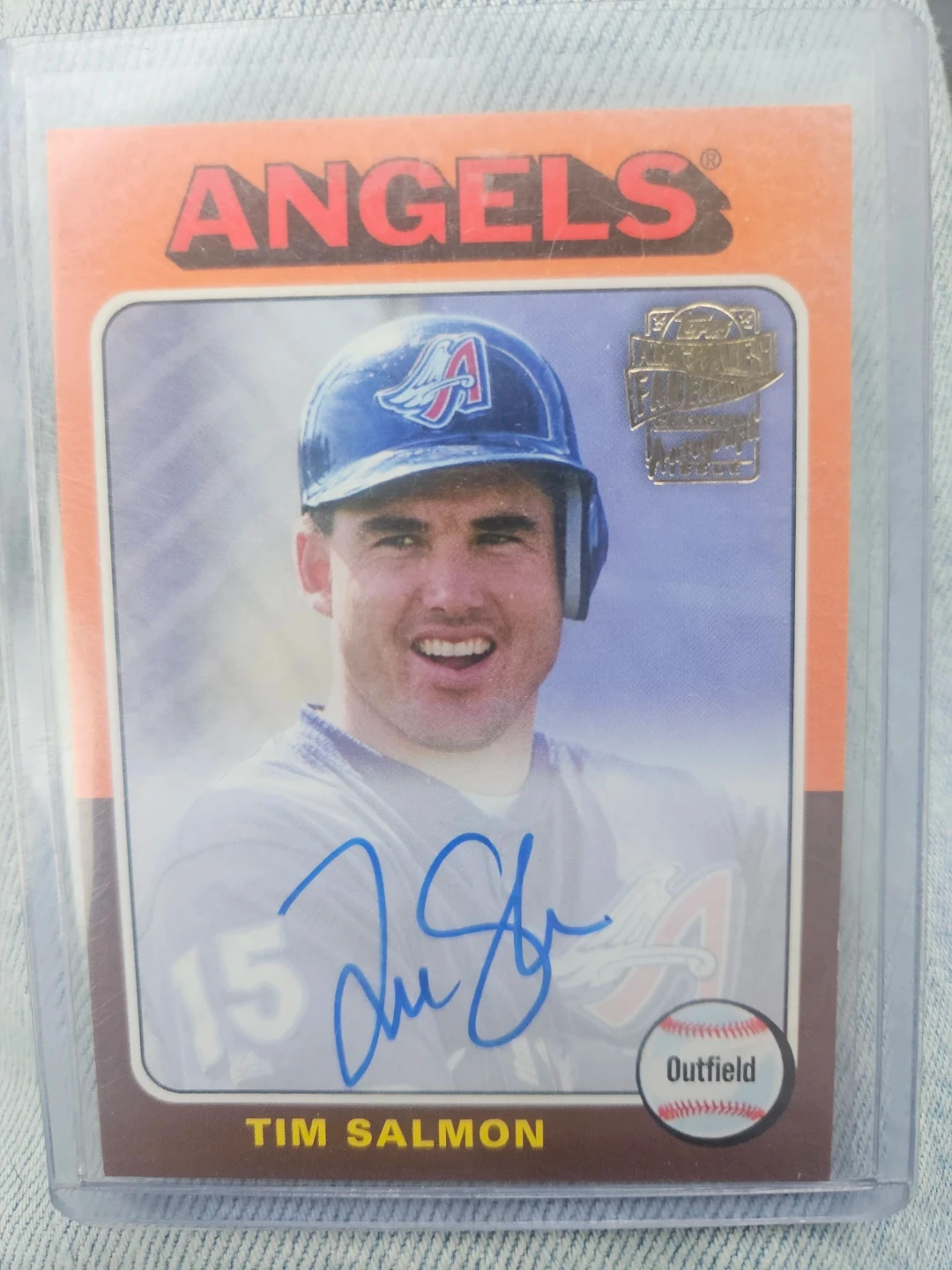 Selling a Tim Salmon baseball card, signed. Card is in good condition and features Tim Salmon in his Angels uniform. A great addition for any baseball card collector!