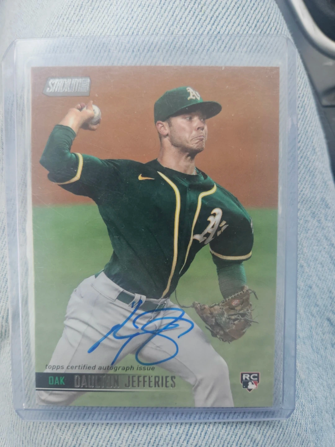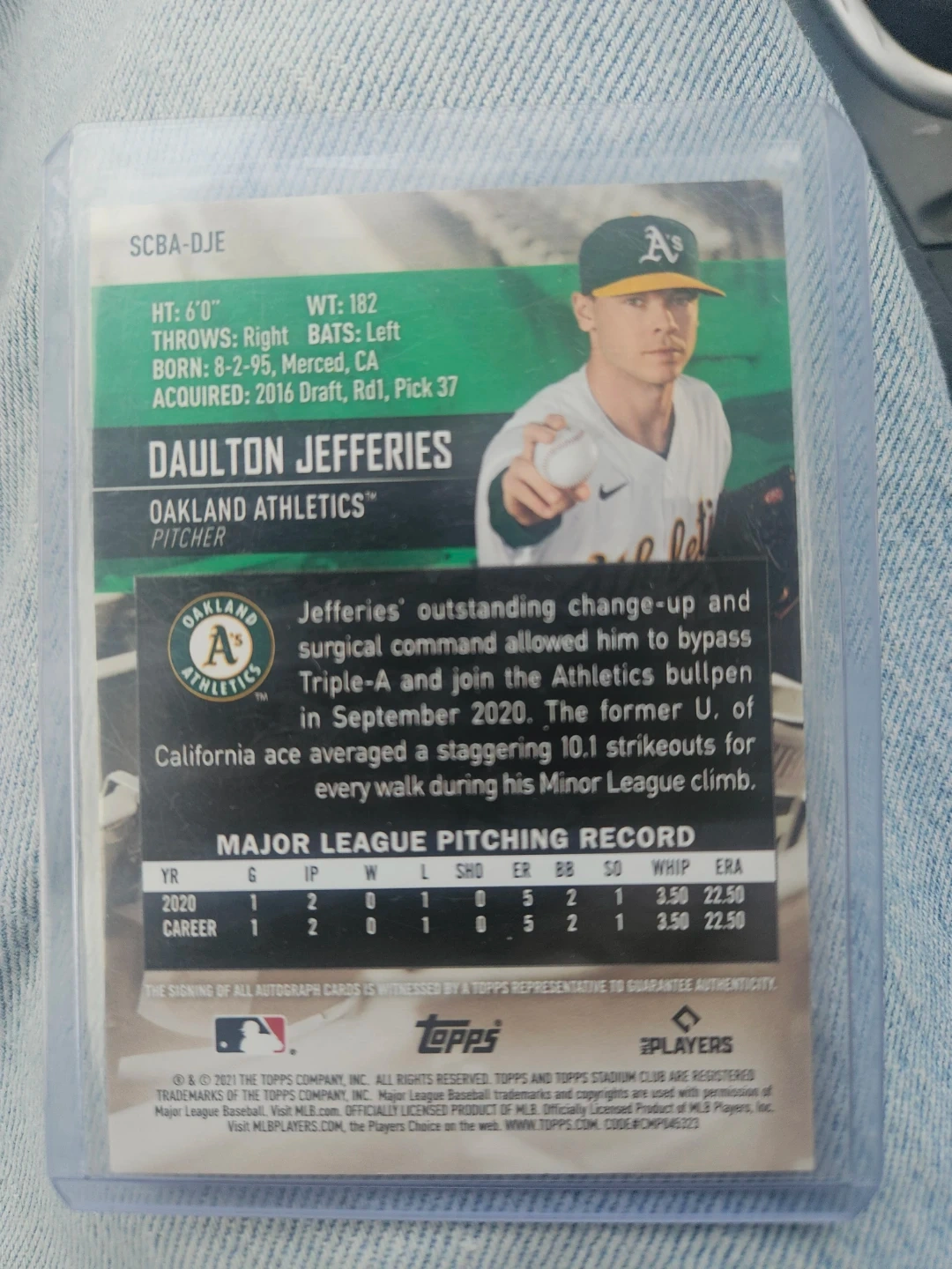 Selling a Daulton Jefferies autographed baseball card. It's in great condition and comes from the Oakland Athletics team. He is a pitcher. Some stats from 2020: 1 IP, 0 W, 1 L, 0 SHO, 0 ER, 0 BB, 0 SO, 1 WHIP, and 22.50 ERA