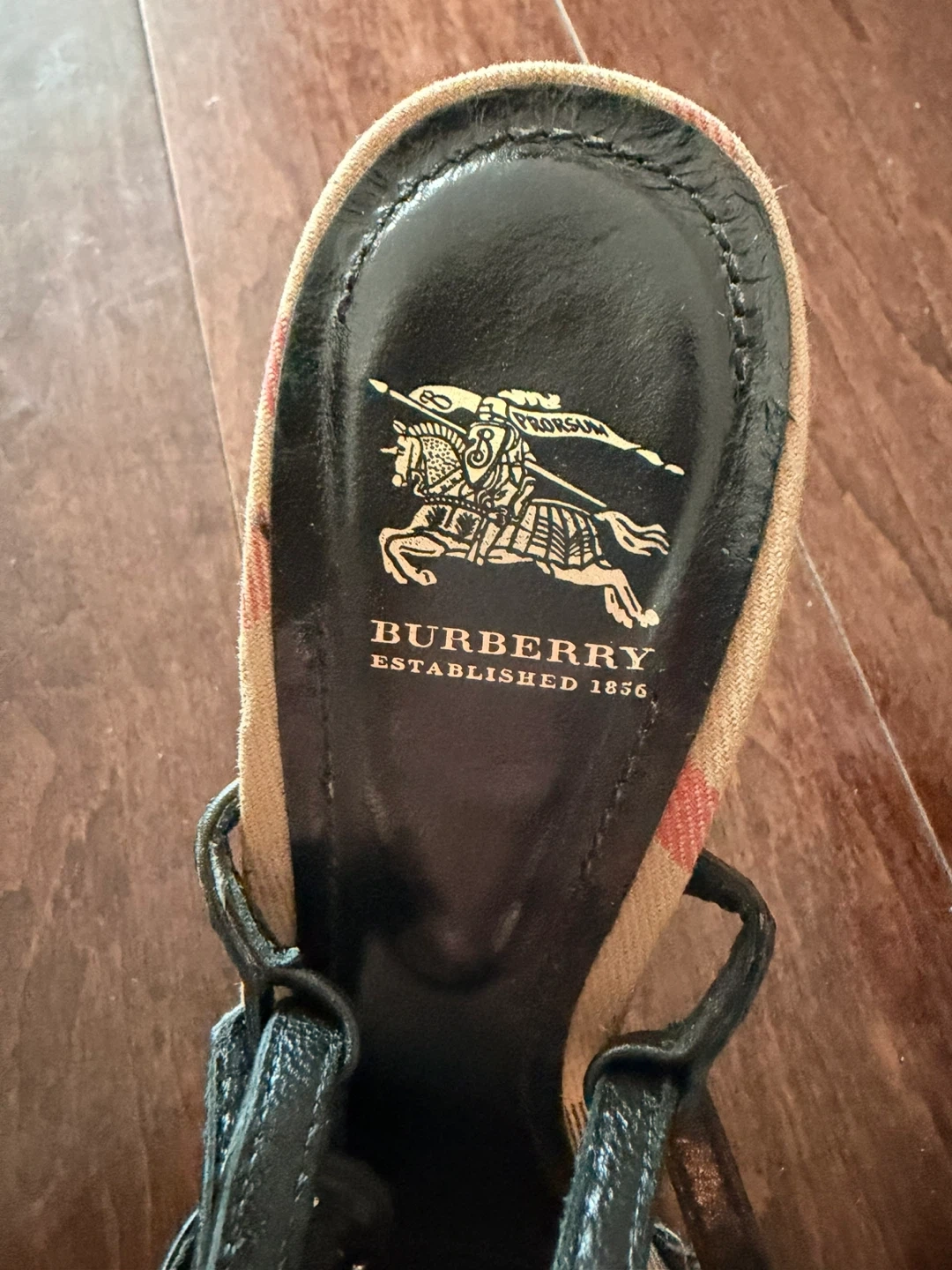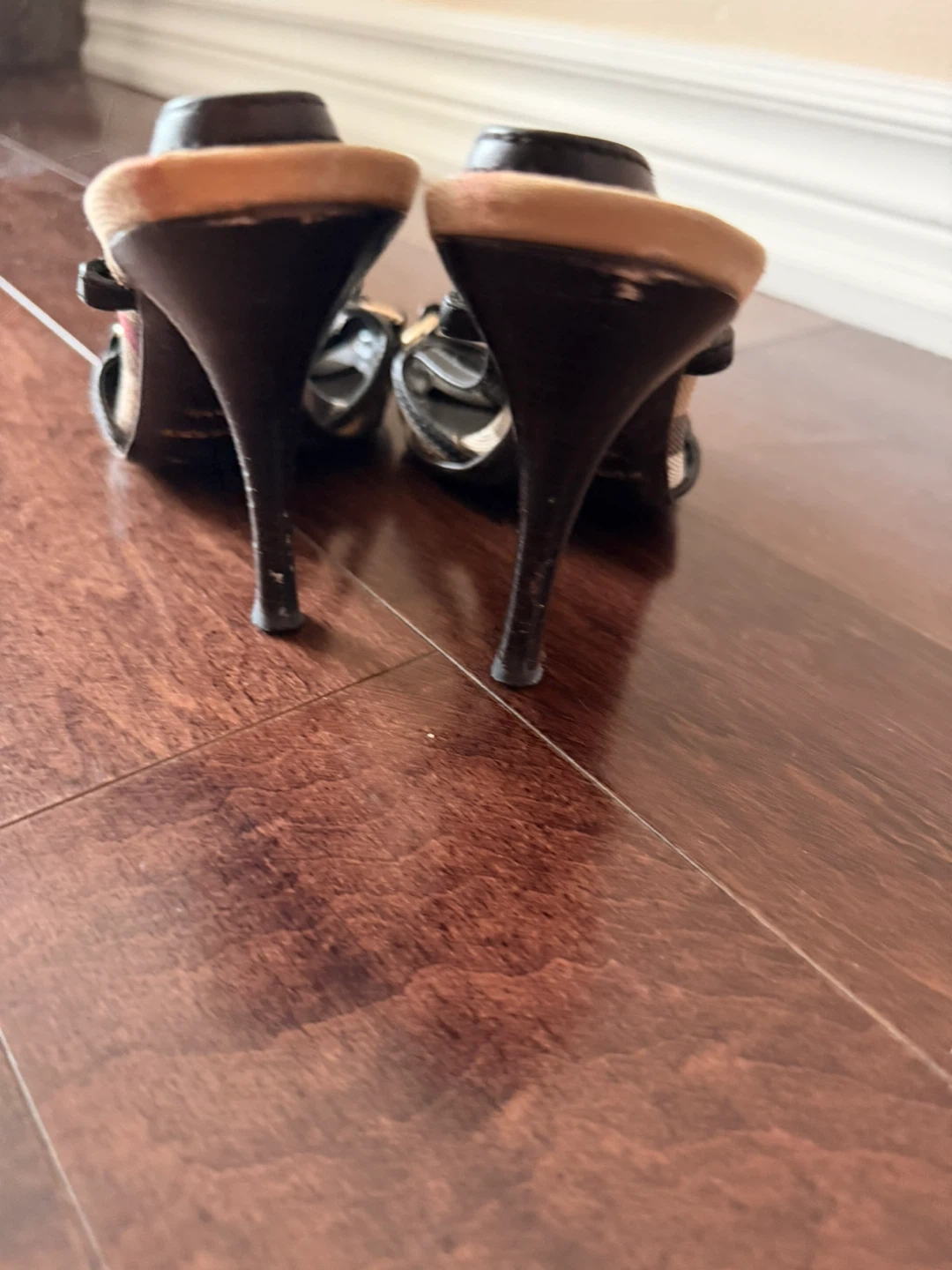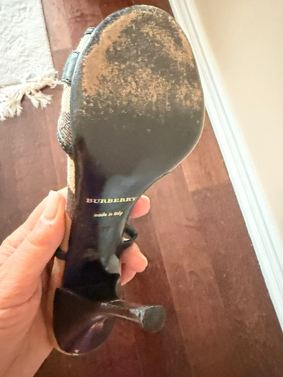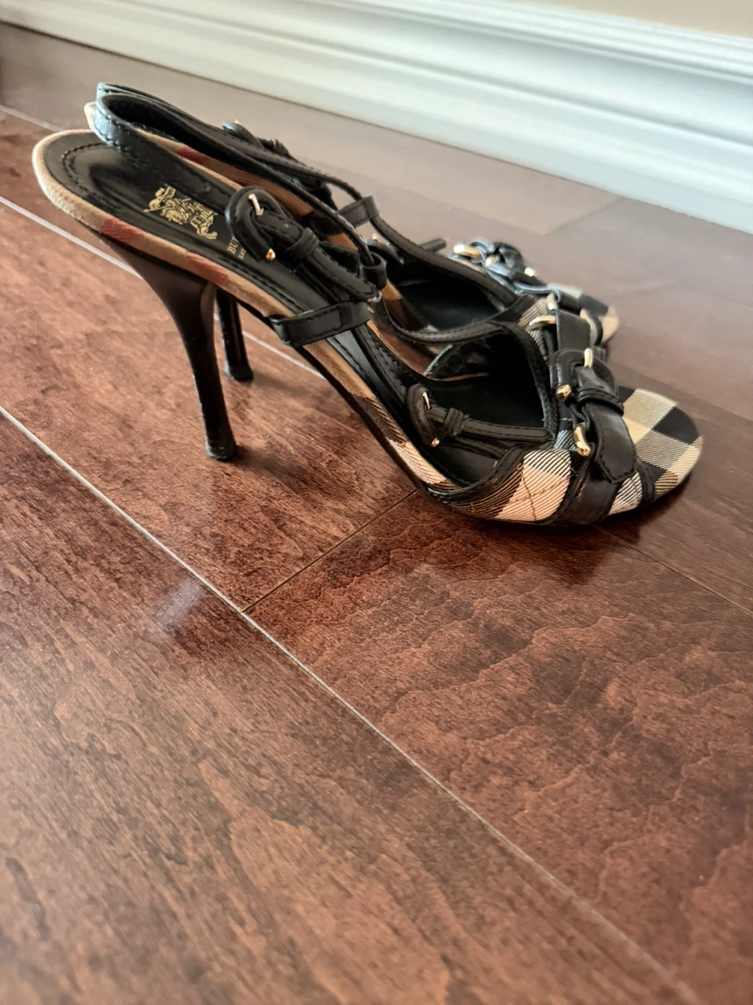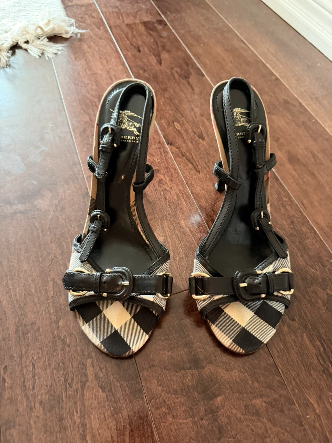 Selling a pair of Burberry heeled sandals in size 39. They feature the classic Burberry check pattern with black leather straps and buckle detailing. The heels show some signs of wear, but they're still stylish and have lots of life left!