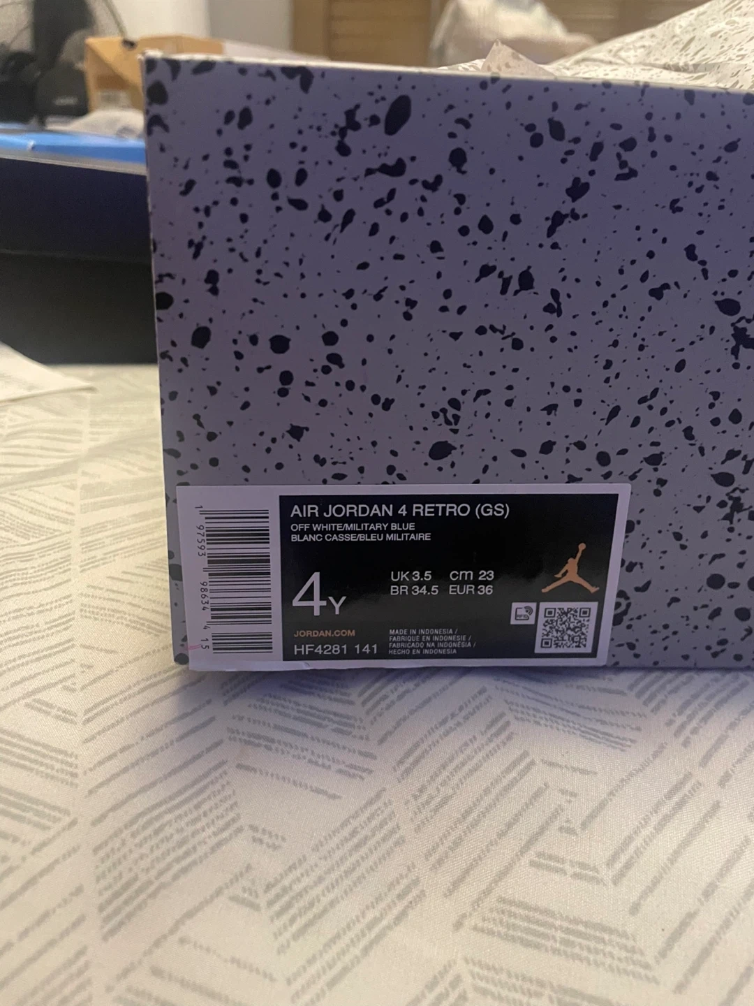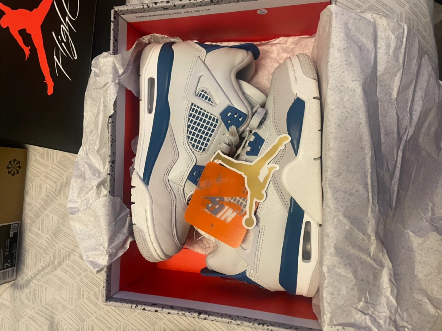 Open to Negotiation- Selling a pair of Air Jordan 4 Retro (GS) in size 4Y. The colour is Off White/Sail/Bleu Militaire. Comes with the original box!