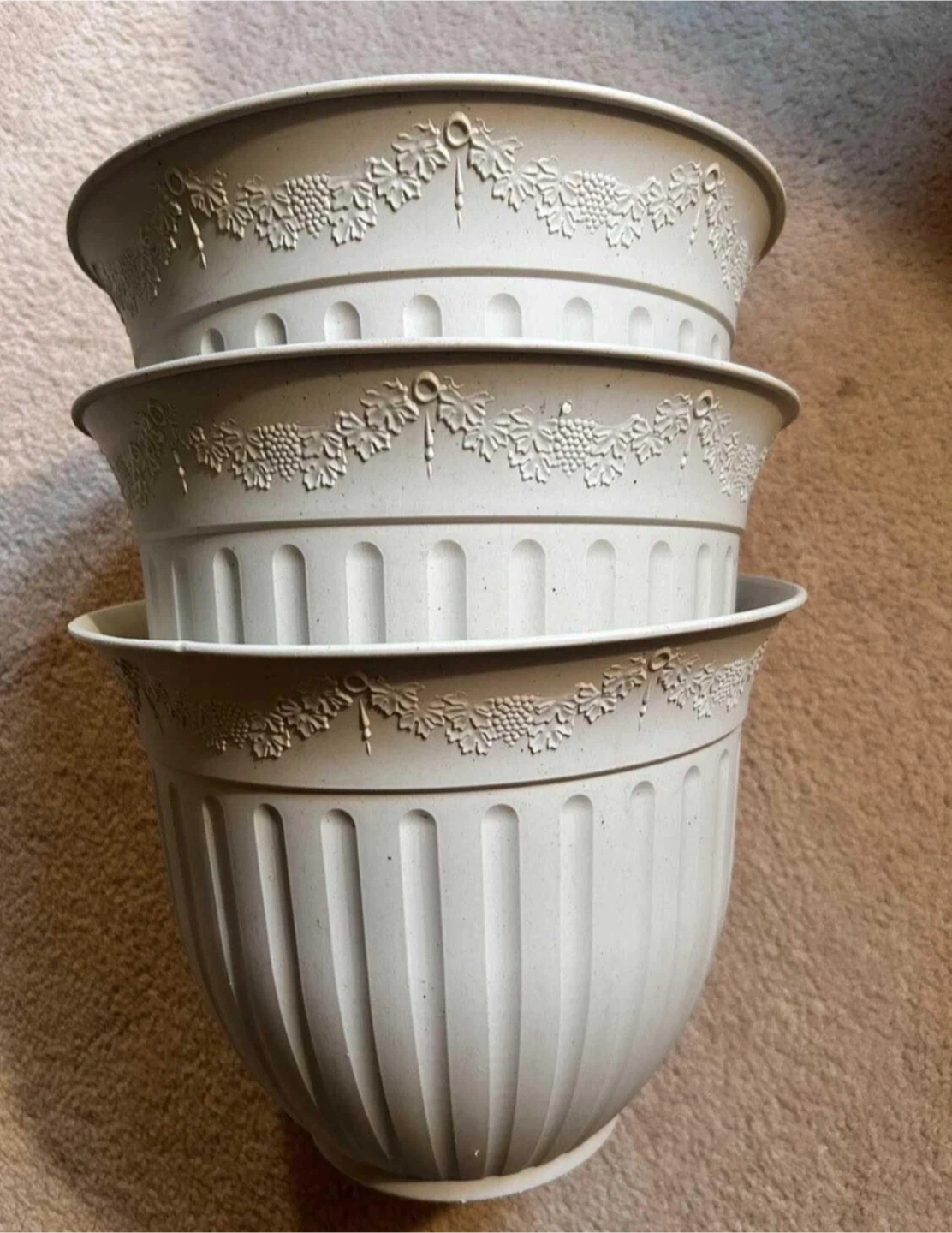 They have a nice grape vine design around the top and vertical ribbing on the bottom. Perfect for your indoor or outdoor plants